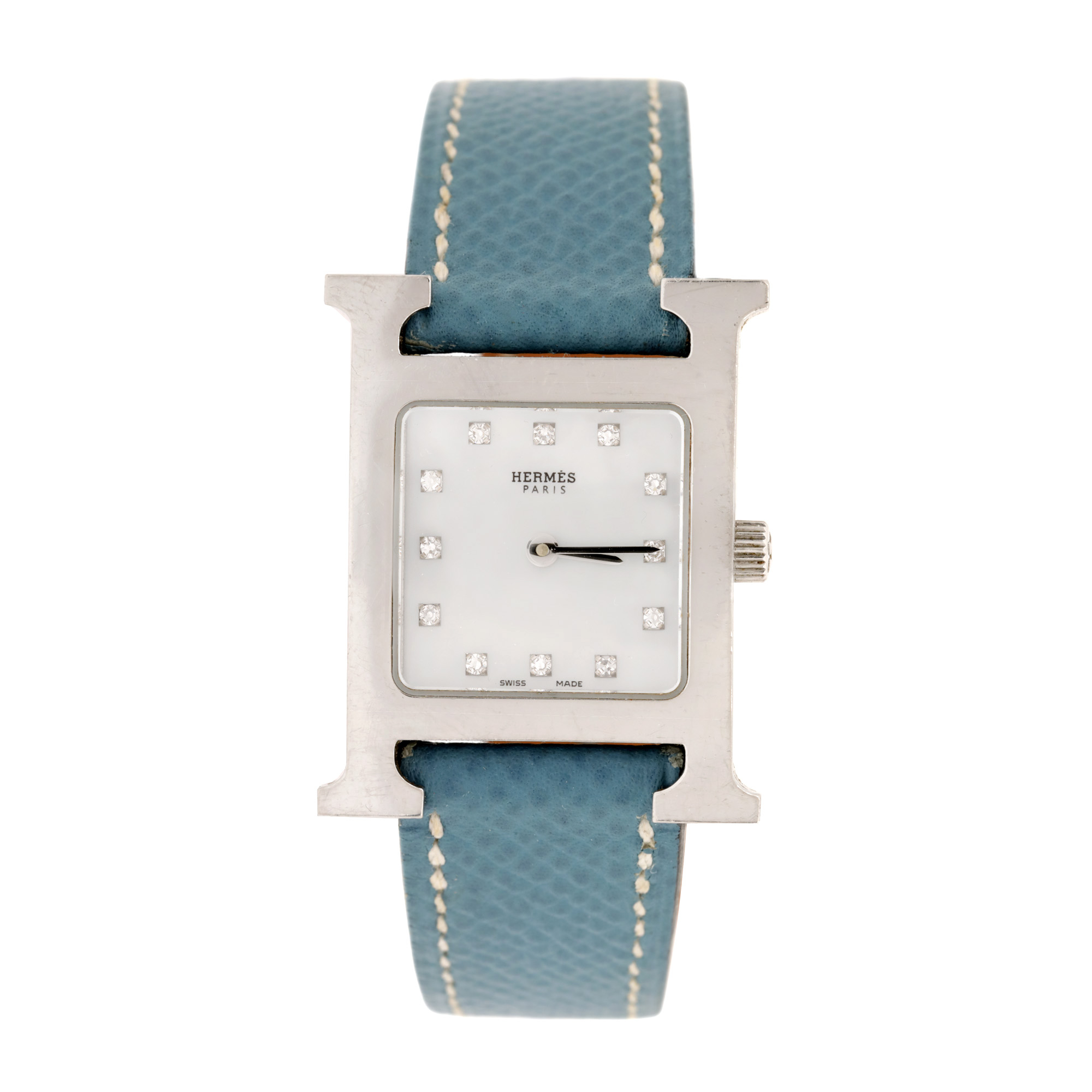 Ceas Hermes l'heure H, de mână, de damă, referință HH1.810. Mecanism quartz, calibrul 255.411. Cadran mother of pearls, indici punctați cu diamante. Curea adăugată aftermarket, din piele, de culoare albastră, cu sistem de închidere de tip clasic cu catarama originală.