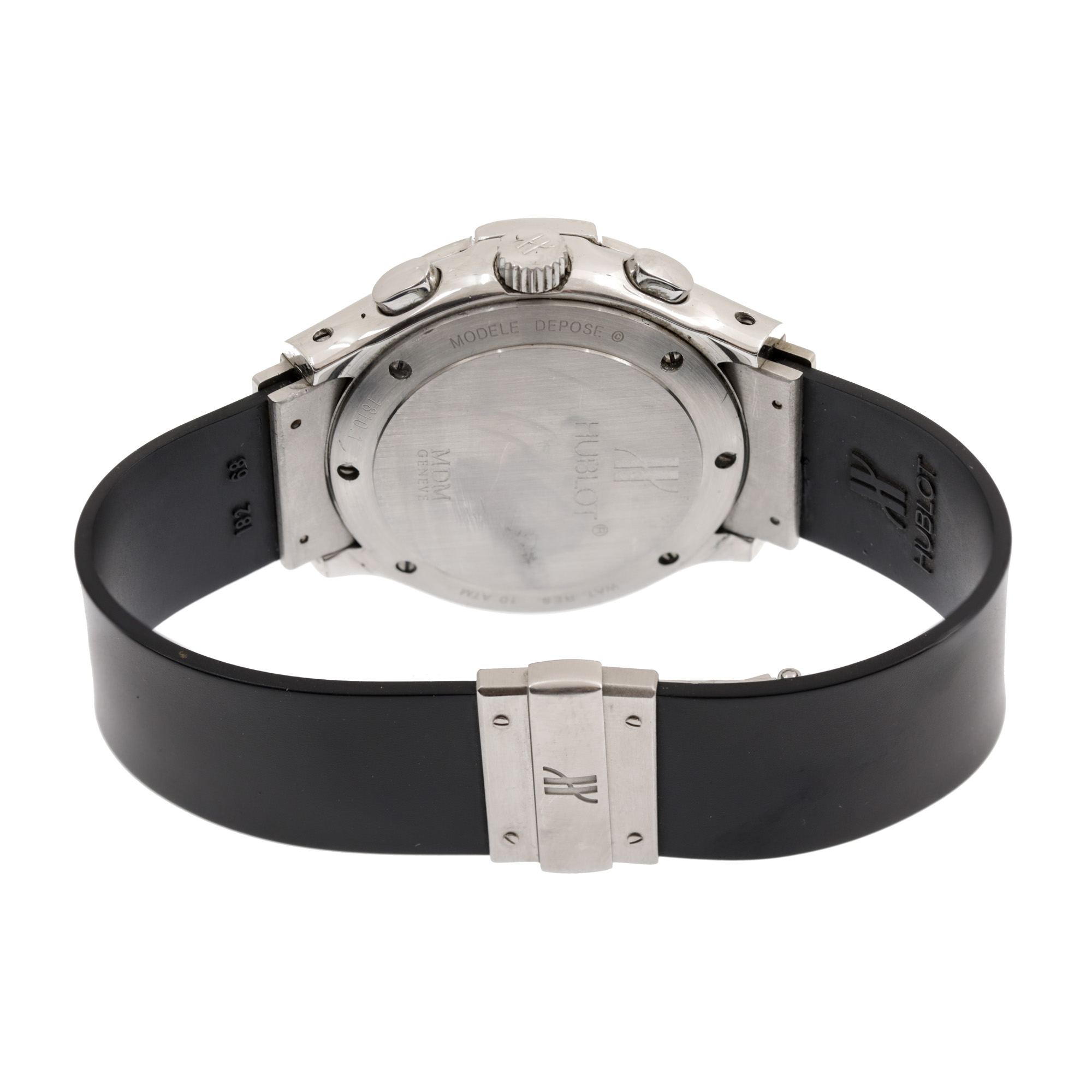 Ceas Hublot MDM Geneve Automatic Chronograph, de mână, unisex, referință 1810.1. Mecanism automatic, calibrul 7750, cu funcție de chronograph. Cadran de culoare negru, indici cu numerale arabe, cu un registru pentru secundar în dreptul orei 3, un registru pentru dată în dreptul orei 4:30 și două registre pentru funcția de chronograph în dreptul orelor 6 și 9. Curea originală, din cauciuc, cu sistem de închidere de tip deployant. Accesorii: card de garanție, cutia originală.