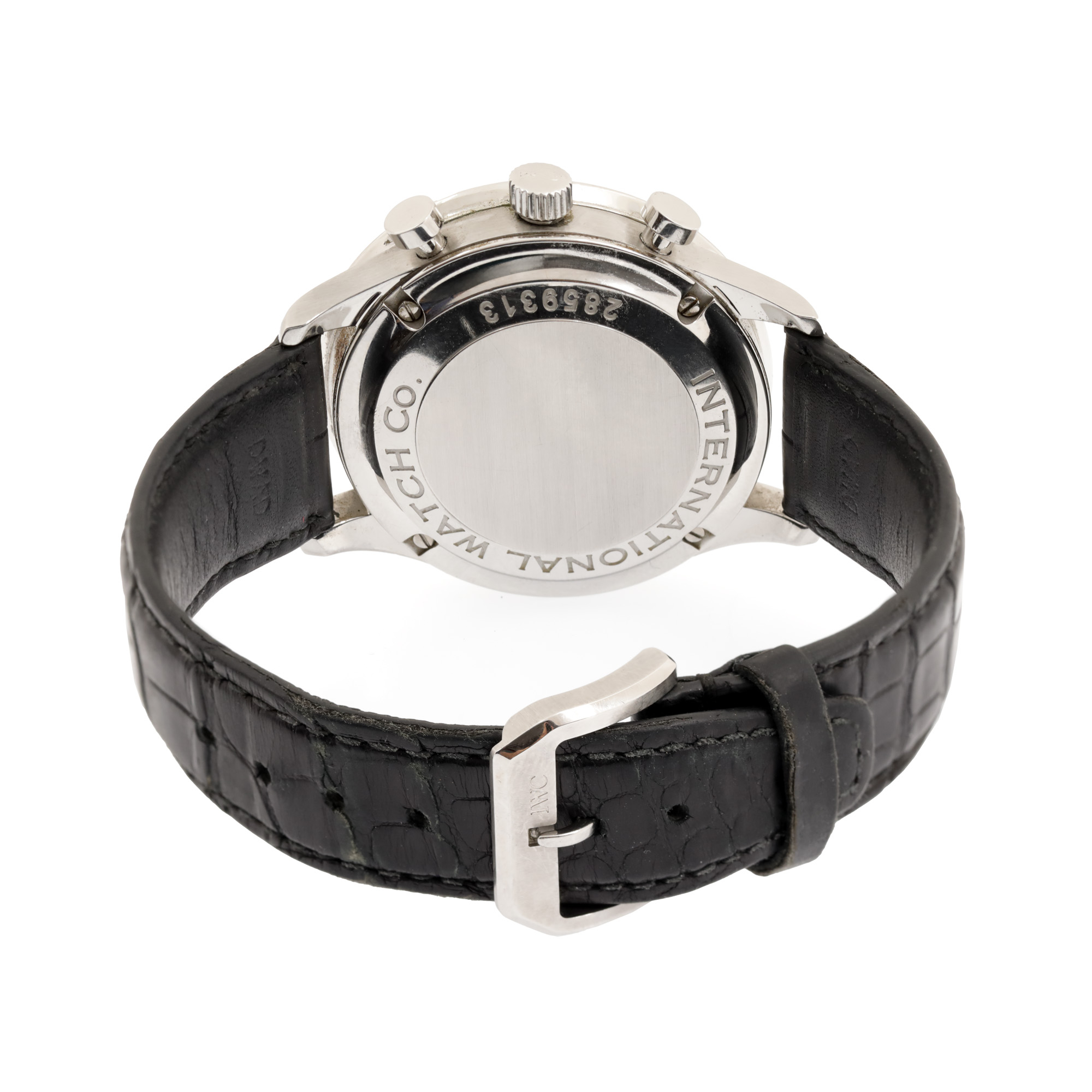 Ceas IWC Portugueser Chronograph, de mână, bărbătesc, referință IW3714. Mecanism automatic, calibrul 79350 cu 31 de rubine, funcție chronograph. Cadran de culoare negru, indici numerale arabe, registru pentru secundar în dreptul orei 6, registru pentru funcția de chronograph în dreptul orei 12. Curea originală, din piele, de culoare neagră, cu sistem de închidere de tip deployant. Accesorii: cutia originală, manual de instrucțiuni și manual de service.