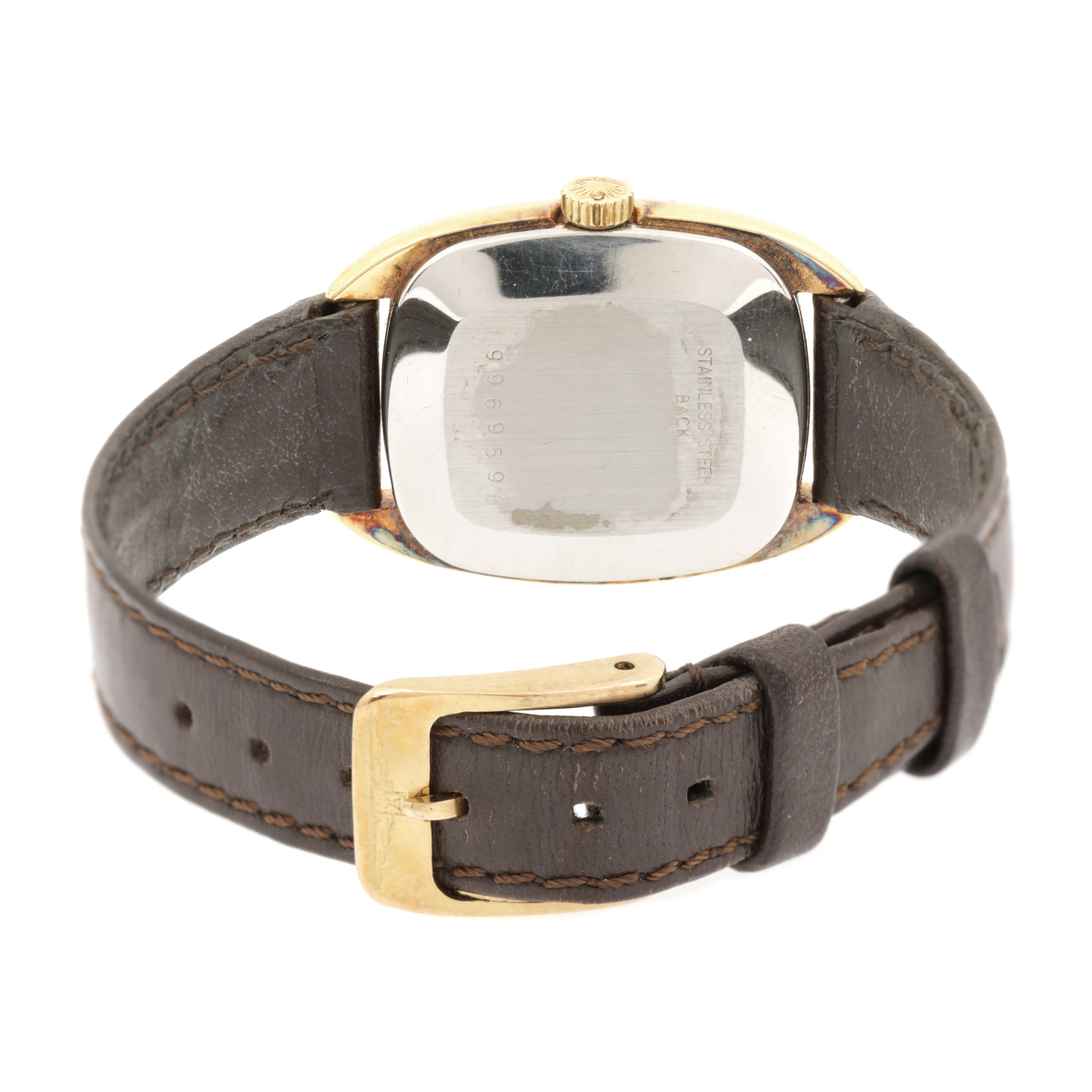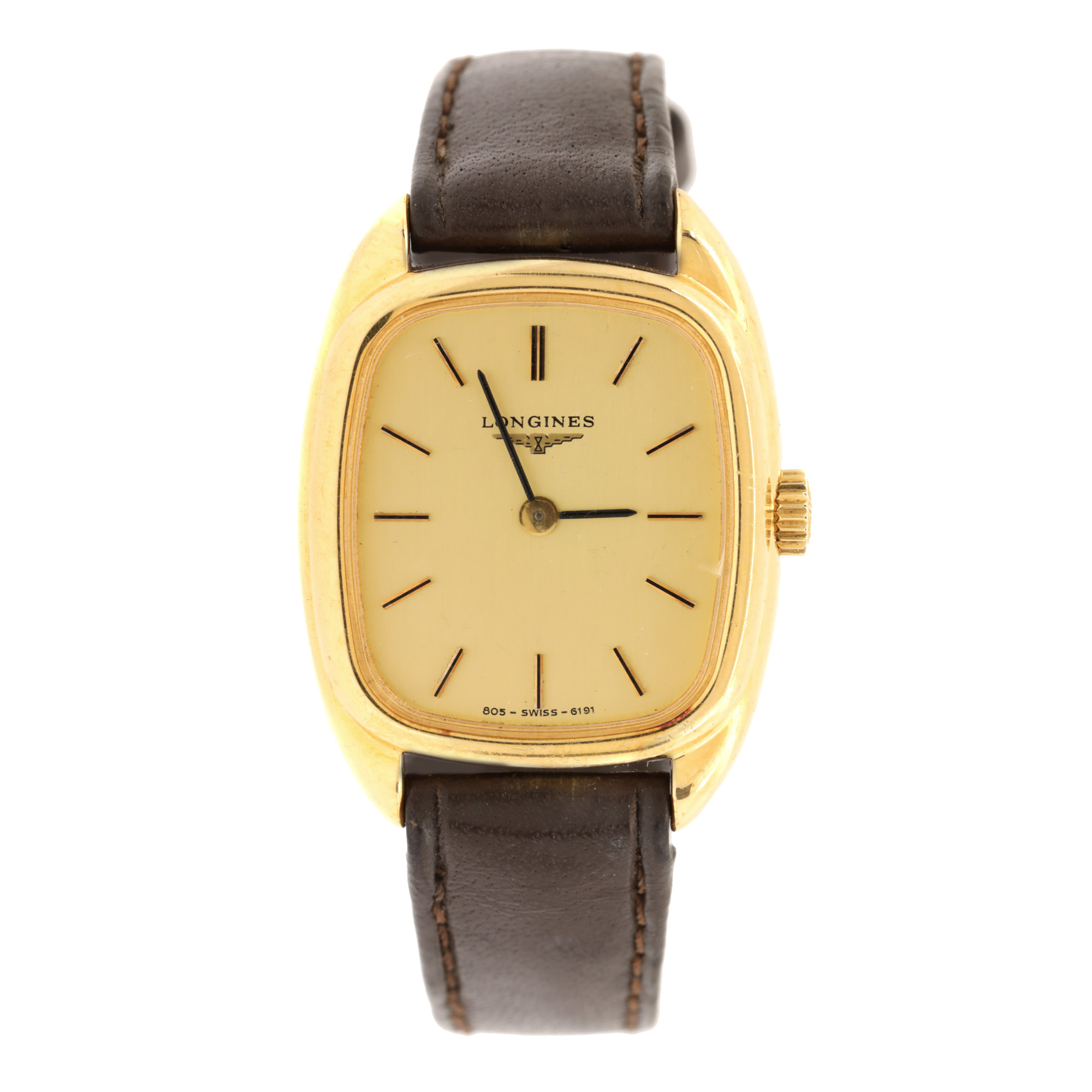 Ceas Longines, de mână, de damă, referință 8661061. Mecanism cu armare manuală, calibrul 6952. Cadran de culoare champagne, indici liniari. Curea adăugată aftermarket, de culoare maro, cu sistem de închidere de tip clasic.