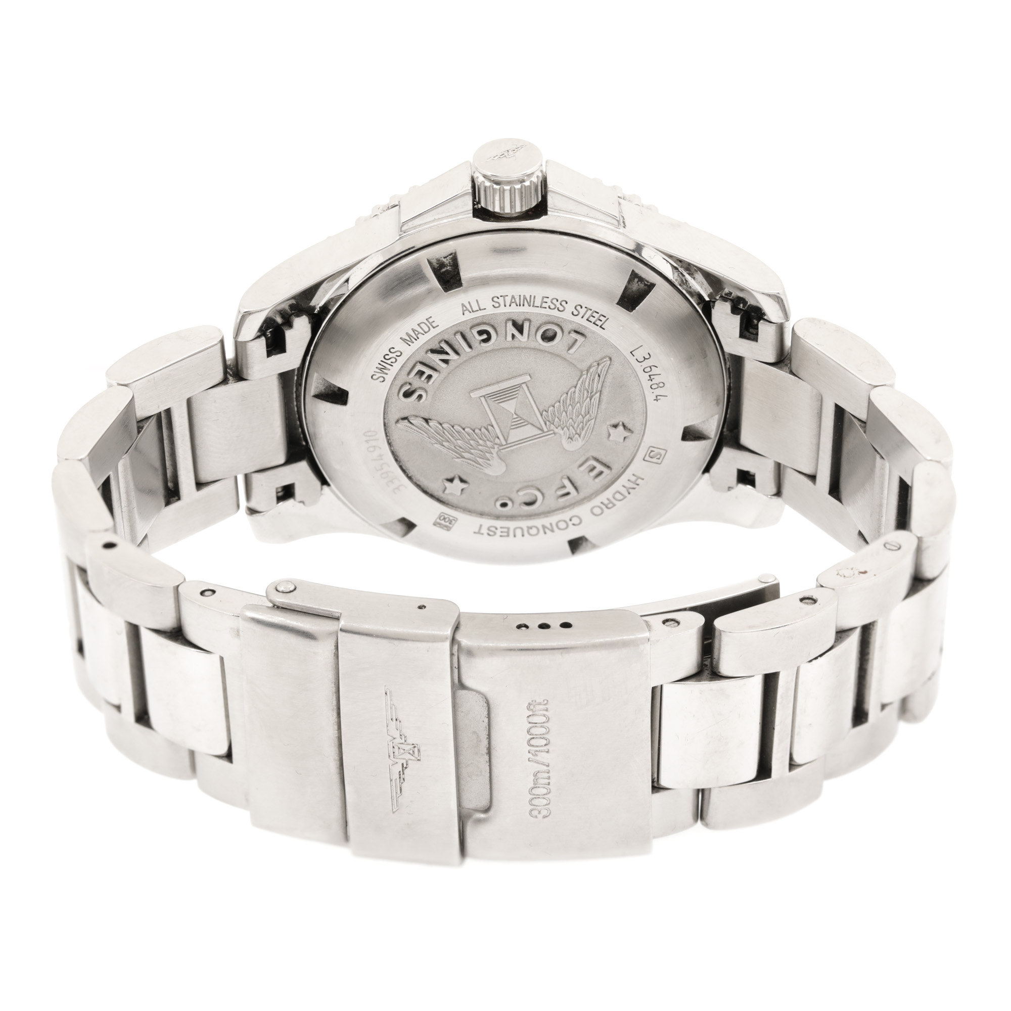 Ceas Longines Hydroconquest, de mână, bărbătesc, referință L3.648.4. Mecanism automatic, calibrul L.633.5. Cadran de culoare alb, indici cu numerale arabe pentru orele 12 și 6, indici baghetă pentru restul orelor, cu un registru pentru dată în dreptul orei 3. Brățară originală, din oțel inoxidabil, cu sistem de închidere de tip deployant.