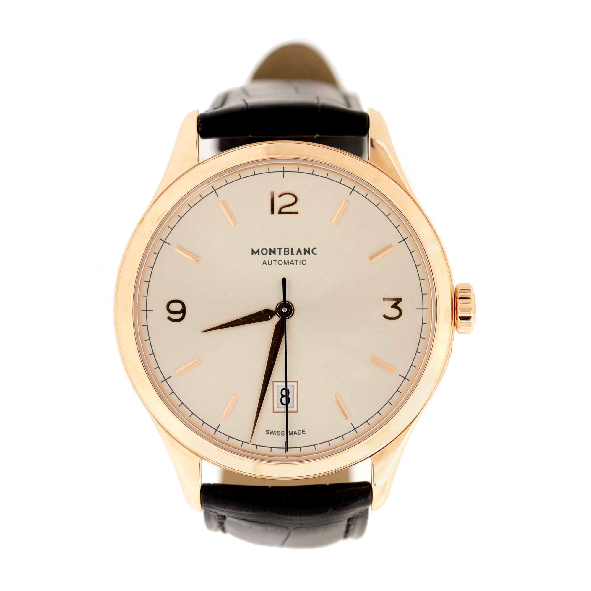 Ceas Montblanc Heritage, din aur, nou, referință 114869. Mecanism automatic, calibrul 2824, anterior vitrat. Cadran de culoare champagne, indici cu numerale arabe pentru orele 12, 3 și 9, inidici baghetă pentru restul orelor, cu un registru pentru dată în dreptul orei 6. Curea originală, din piele, de culoare neagră, cu sistem de închidere de tip clasic. Accesorii: cutia originală, card de garanție.