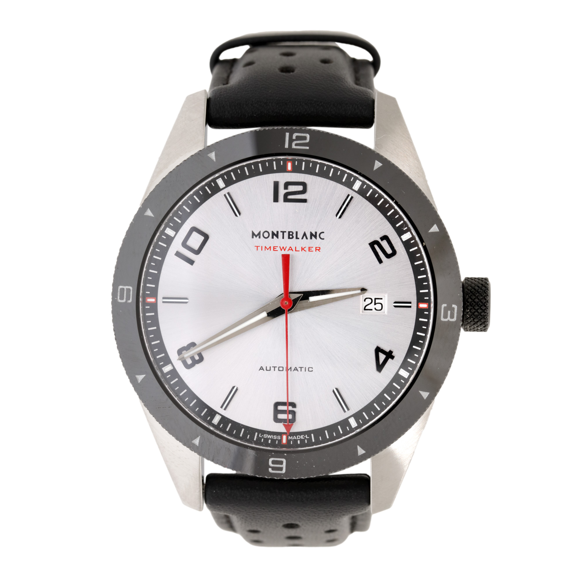 Ceas Montblanc Timewalker, nou, de mână, bărbătesc,, referință 116058. Mecanism automatic, calibrul 2824, anterior vitrat. Cadran de culoare argintiu, indici cu numerale arabe, cu un registru pentru dată în dreptul orei 3. Curea originală, din piele, de culoare neagră, cu sistem de închidere de tip clasic. Accesorii: cutia originală, card de garanție.