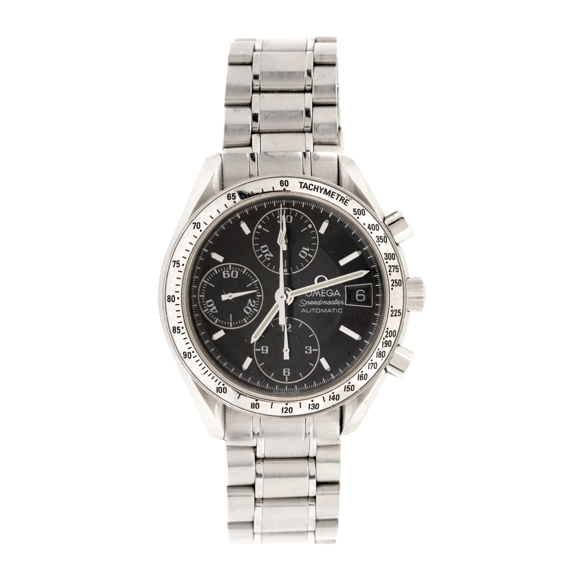 Ceas Omega Speedmaster, de mână, bărbătesc, referință 3513-50. Mecanism automatic, calibrul 1153 (Valjoux 7750) cu funcție de chronograph. Cadran de culoare negru, indici baghetă, registru pentru dată în dreptul orei 3, două registre pentru funcția de chronograph în dreptul orelor 12 și 6 și registru pentru secundar în dreptul orei 9. Brățară originală, din oțel, cu sistem de închidere de tip deployant.