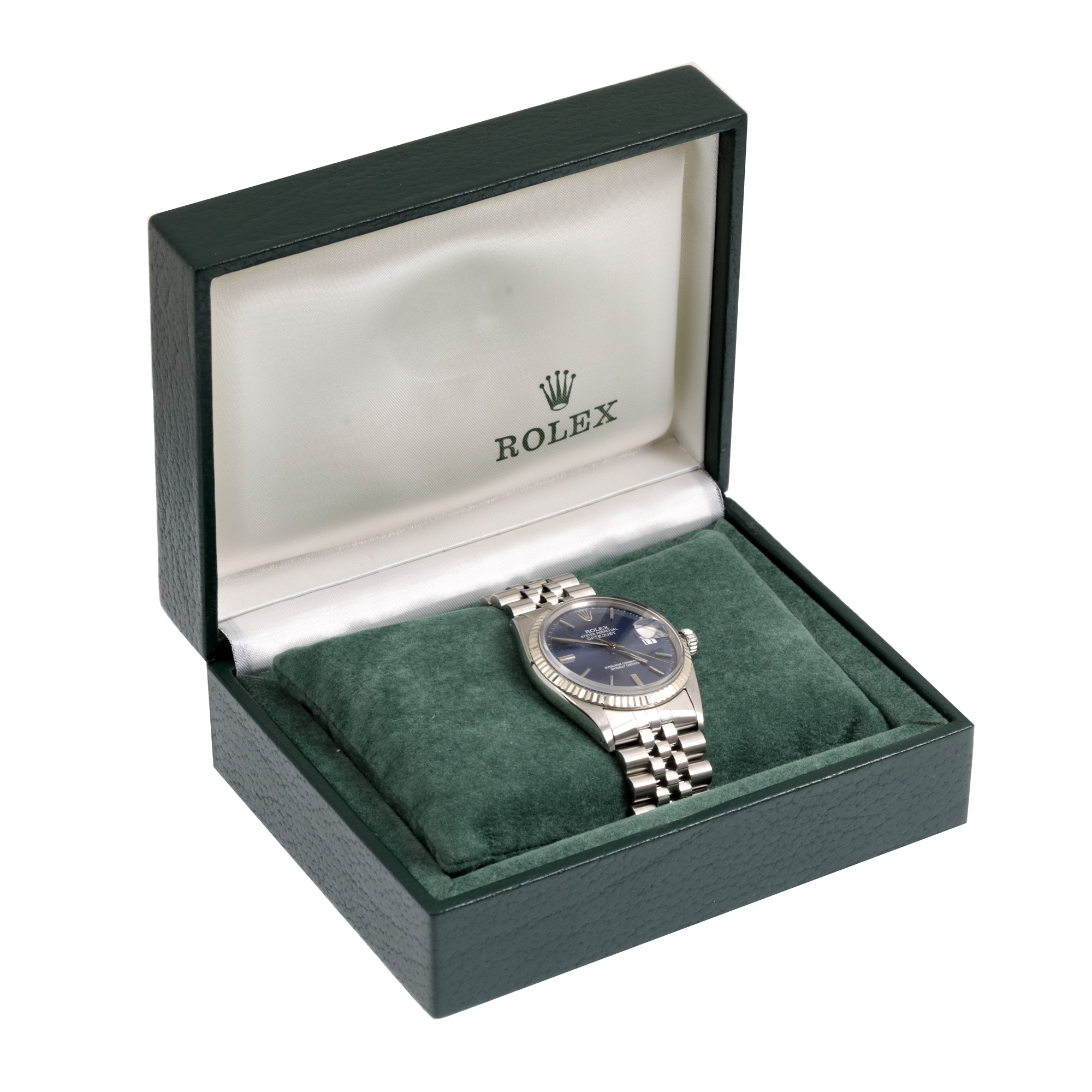 Ceas Rolex Datejust, de mână, bărbătesc, referință 1603. Mecanism automatic, calibrul 1570. Cadran de culaore albastru, indici baghetă, cu un registru pentru dată în dreptul orei 3. Brățară originală, din oțel inoxidabil, cu sistem de închidere de tip clasic. Accesorii: cutia originală.