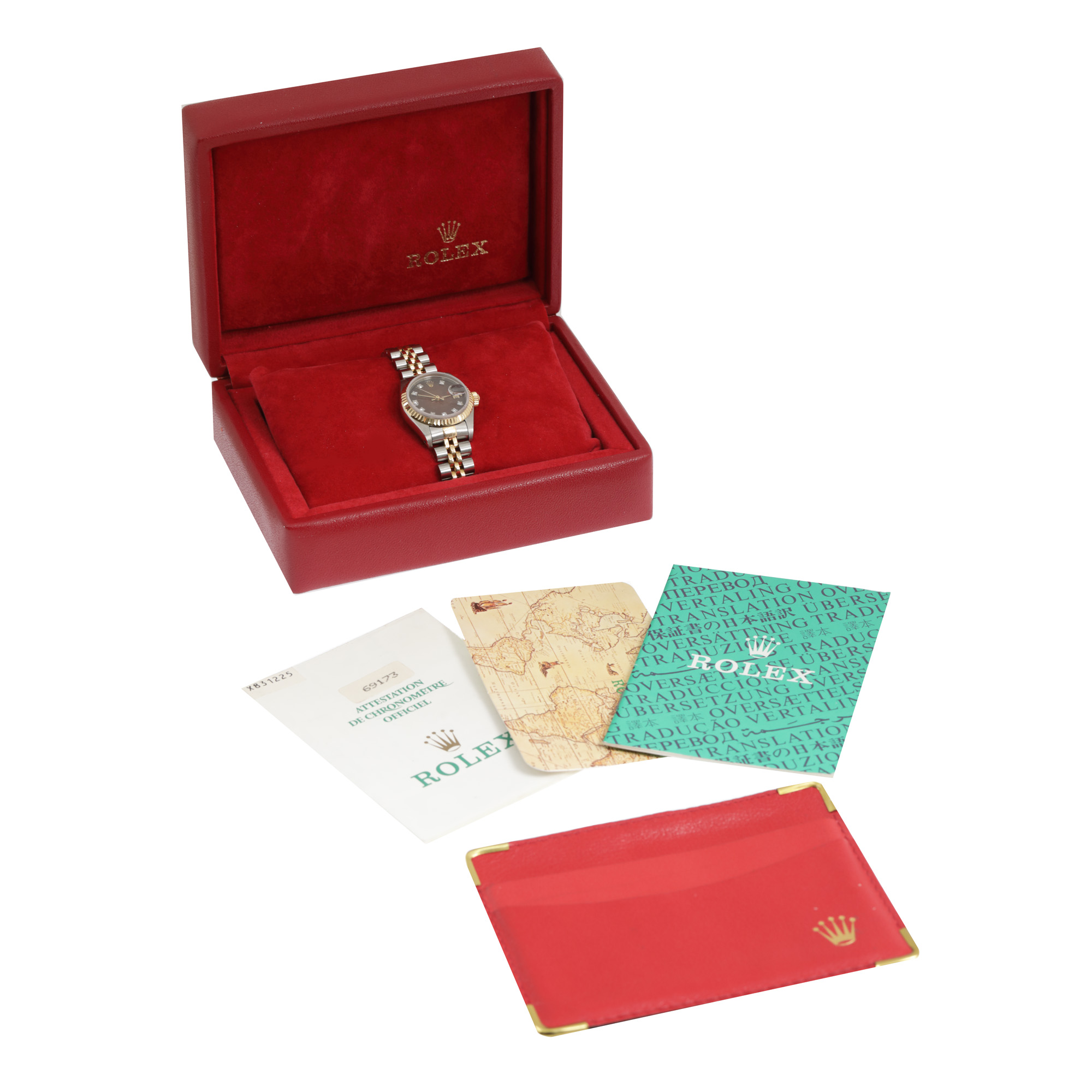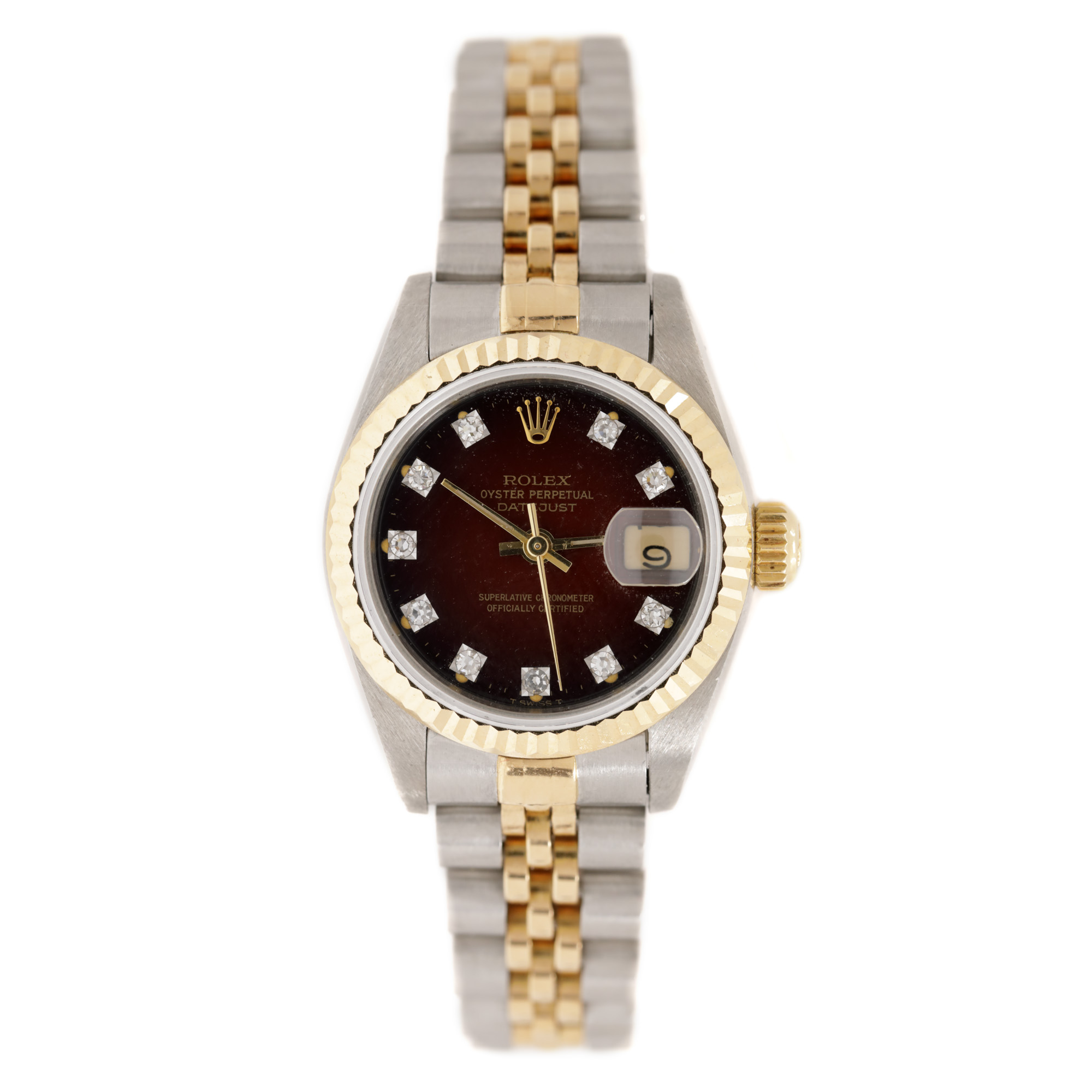 Ceas Rolex Datejust lady, din aur și oțel, cu diamante, de mână, de damă, referință 69173. Mecanism automatic, calibrul 2135. Cadran de culoare bordeux, indici diamante, registru cu lupă pentru dată în dreptul orei 3. Brățară originală, din aur și oțel, cu sistem de închidere de tip deployant. Accesorii: cutia originală, certificat de atestare a chronometrului și de garanție.