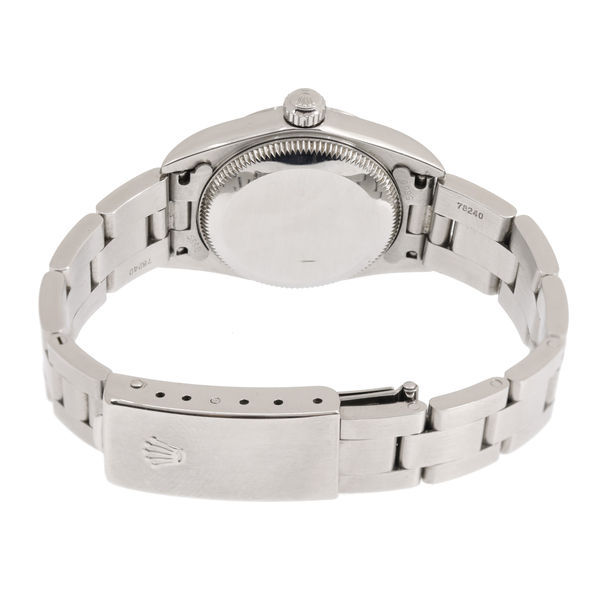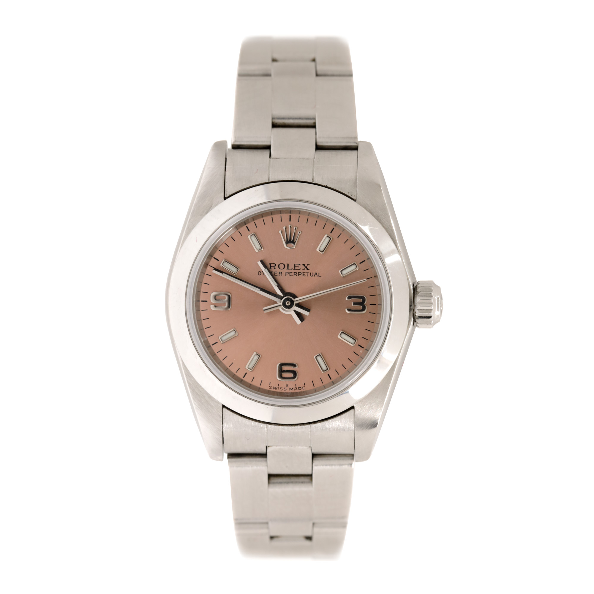Ceas Rolex Oyster Perpetual, de mână, de damă, referință 76080. Mecanism automatic, calibrul 2230. Cadran de culoare roz, indici cu numerale arabe pentru orele 3, 6, 9, indici baghetă pentru restul orelor. Brățară originală, din oțel inoxidabil, cu sistem de închidere de tip deployant. Accesorii: cutie originală, certificat de garanție și zale suplimentare.
