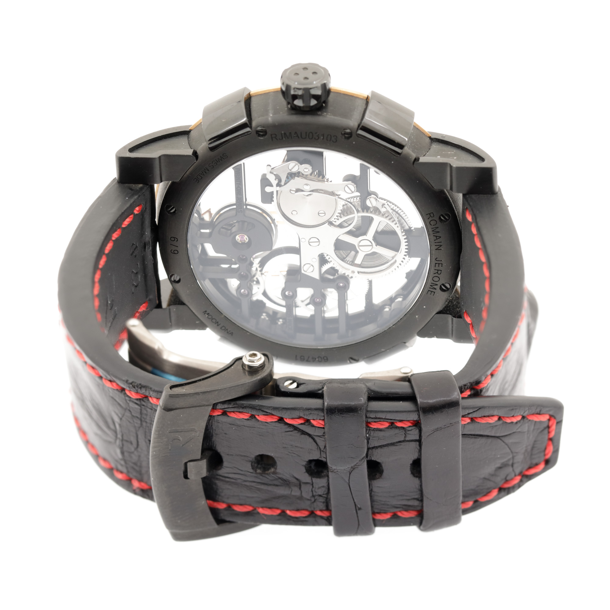 Ceas Romain Jerome Moon DNA, din aur și oțel, de mână, bărbătesc, referință RJ.M.AU.031.01. Mecanism cu armare manuală, calibrul RJ004-M. Cadran skeleton, indici figurativi, cu un registru pentru secundar în dreptul orei 7:30. Curea originală, din piele, de culoare neagră, cu sistem de închidere de tip deployant.