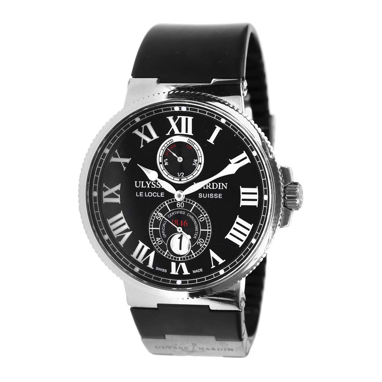 Ceas Ulysse Nardin Marine Chronometer, de mână, bărbătesc, referință UN-26. Mecanism automatic, cu funcție de afișaj al autonomiei, calibrul UN-26. Cadran de culoare negru, indici cu numerale romane, cu un registru pentru afișajul autonomiei în dreptul orei 12, un registru pentru secundar în dreptul orei 6 și un câmp pentru dată în dreptul orei 6. Curea originală, din cauciuc, de culoare neagră, cu sistem de închidere de tip deployant.