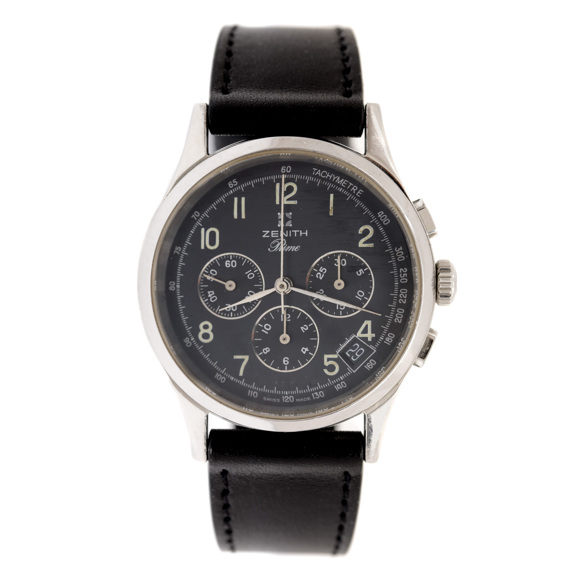 Ceas Zenith Elite El Primero Chronograph, de mână, bărbătesc, referință 010010420. Mecanism cu armare manuală, calibrul 420, anterior vitrat. Cadran de culoare neagră, indici cu numerale arabe, cu un registru pentru dată între orele 4 și 5, un registru pentru secundar în dreptul orei 9 și două registre pentru funcția de chronograph în dreptul orelor 3 și 6. Curea adăugată aftermarket, din piele, de culoare negru, cu sistem de închidere clasic. Accesorii: cutie originală.