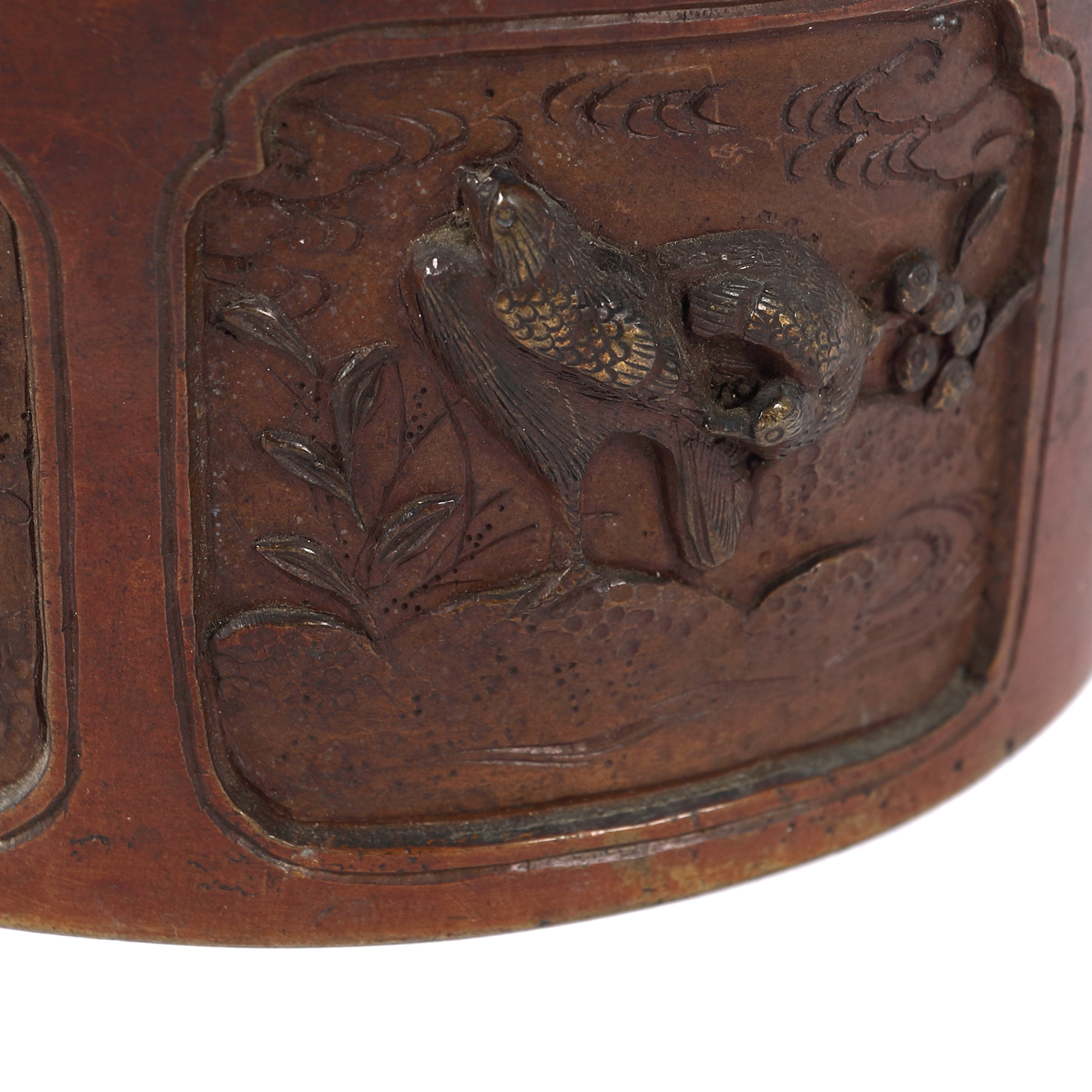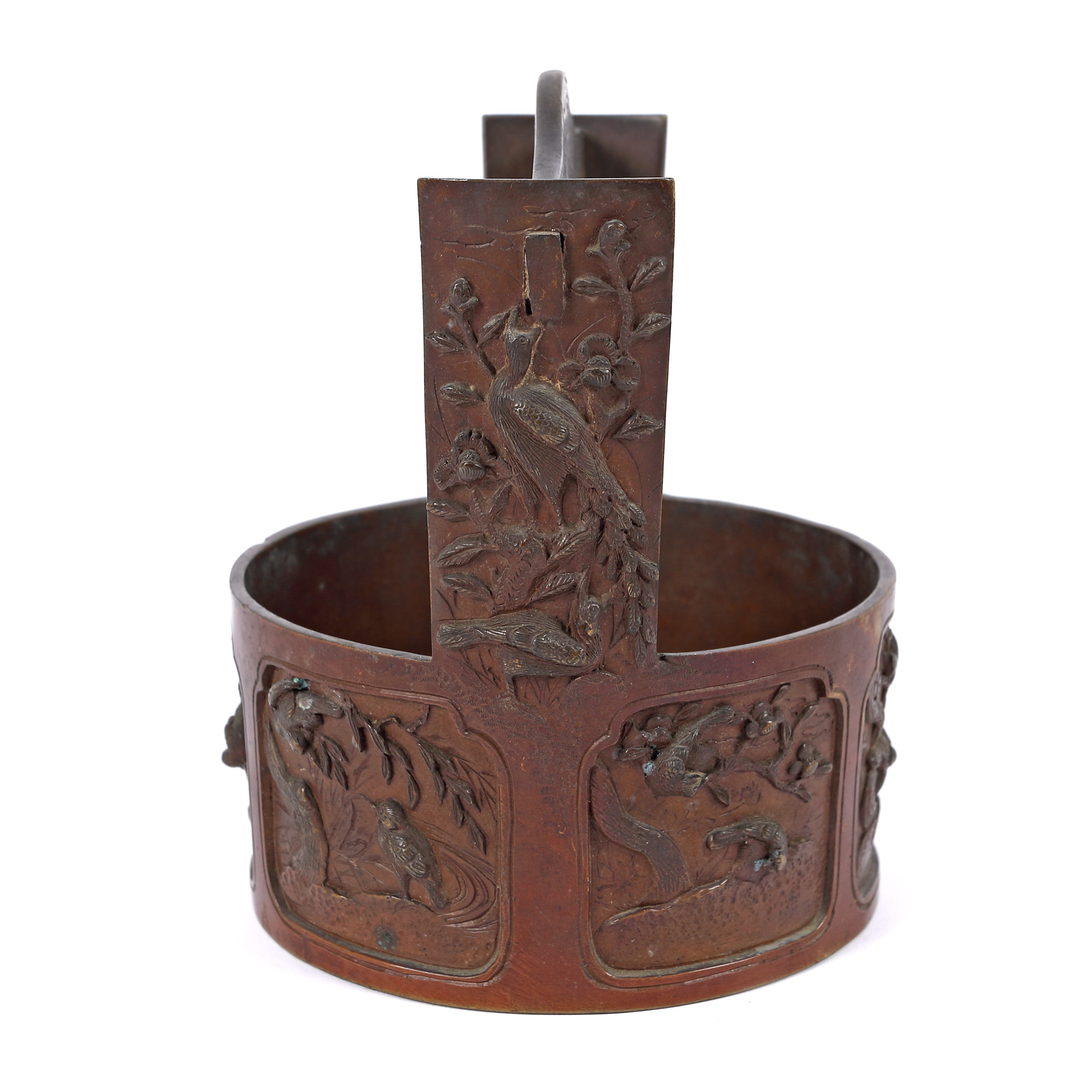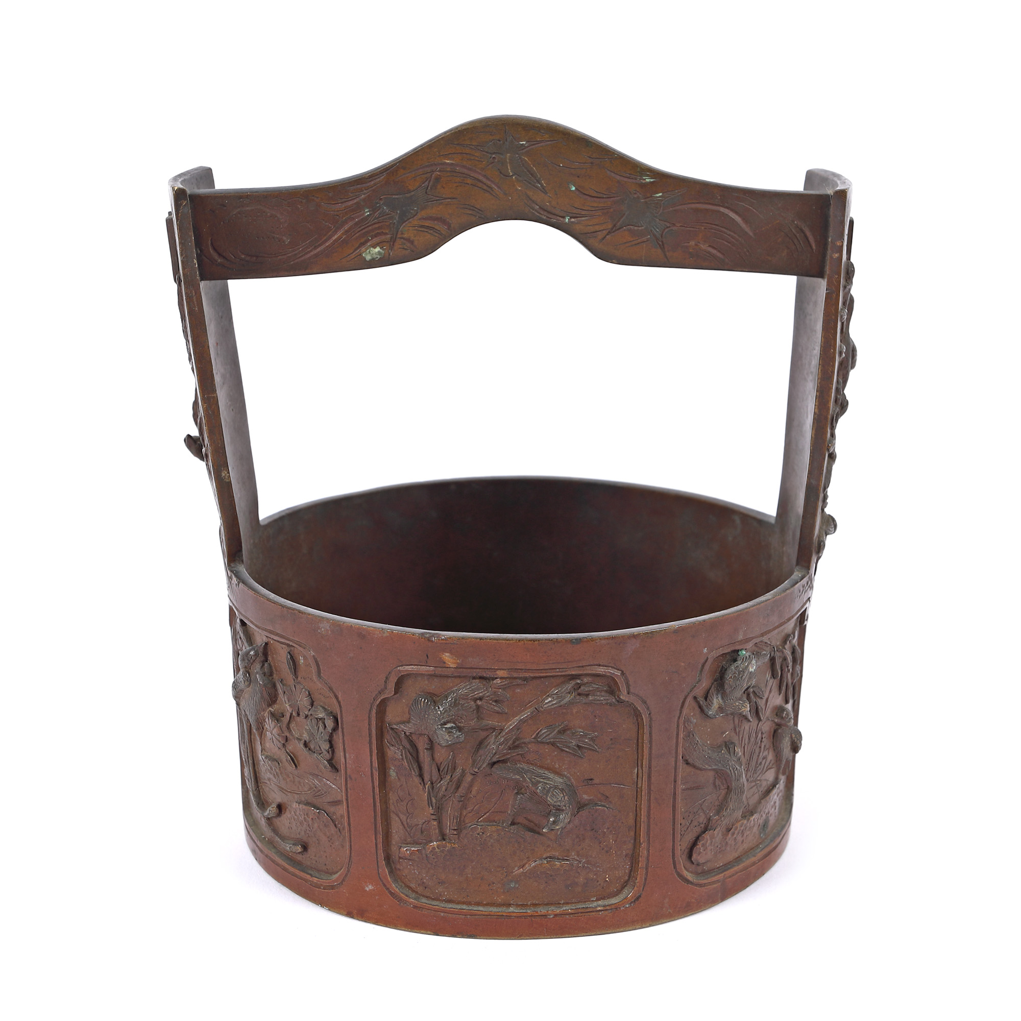 167. Coș din bronz, decorat cu motive florale, perioada Meiji, Japonia, începutul sec. XX