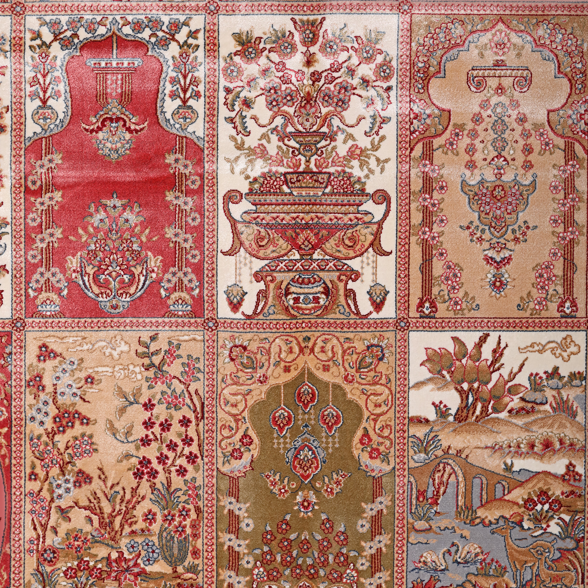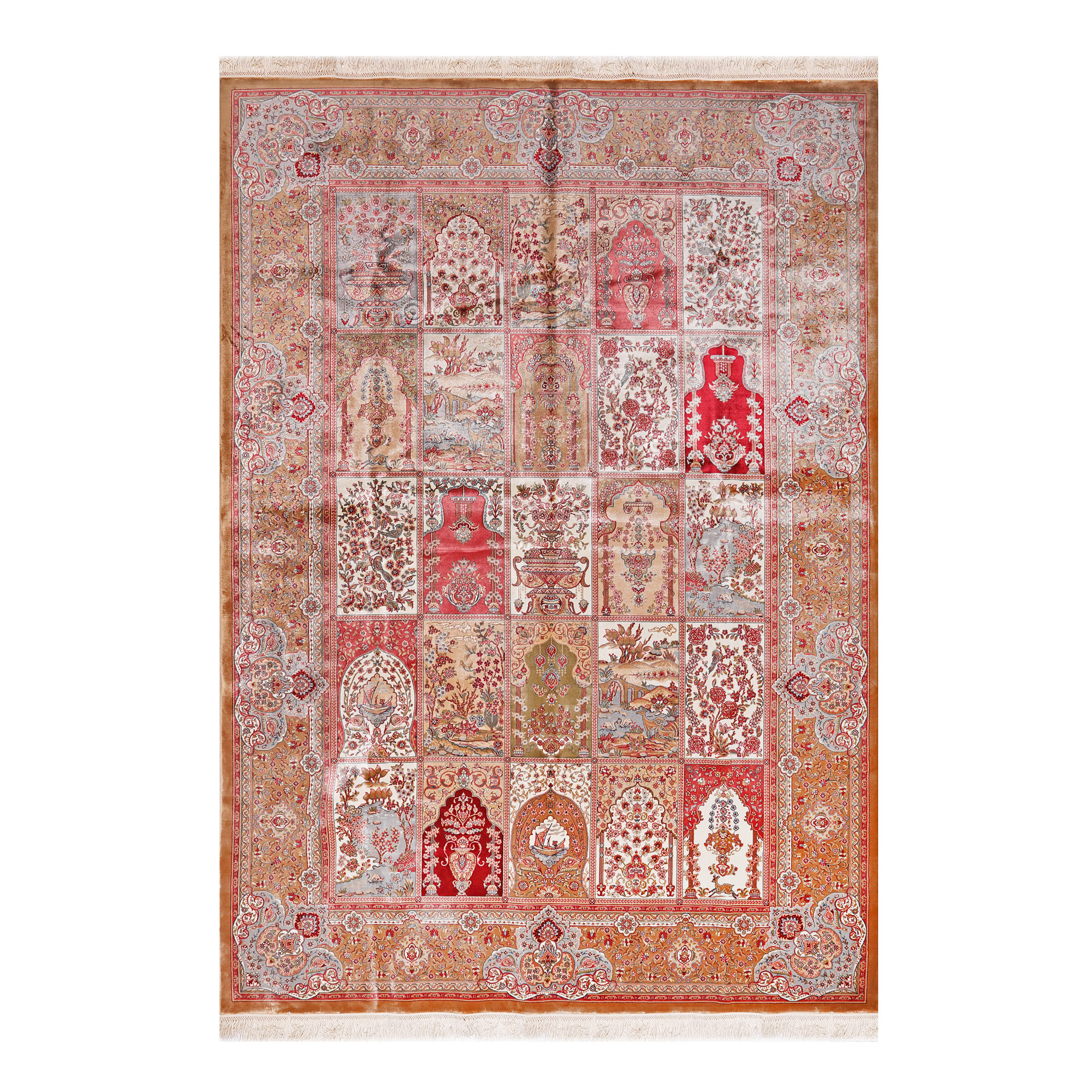 132. Covor Hereke din mătase pe bumbac satinat, decorat cu diverse scene și motive tradiționale, Turcia [a doua jumătate a sec. XX]
