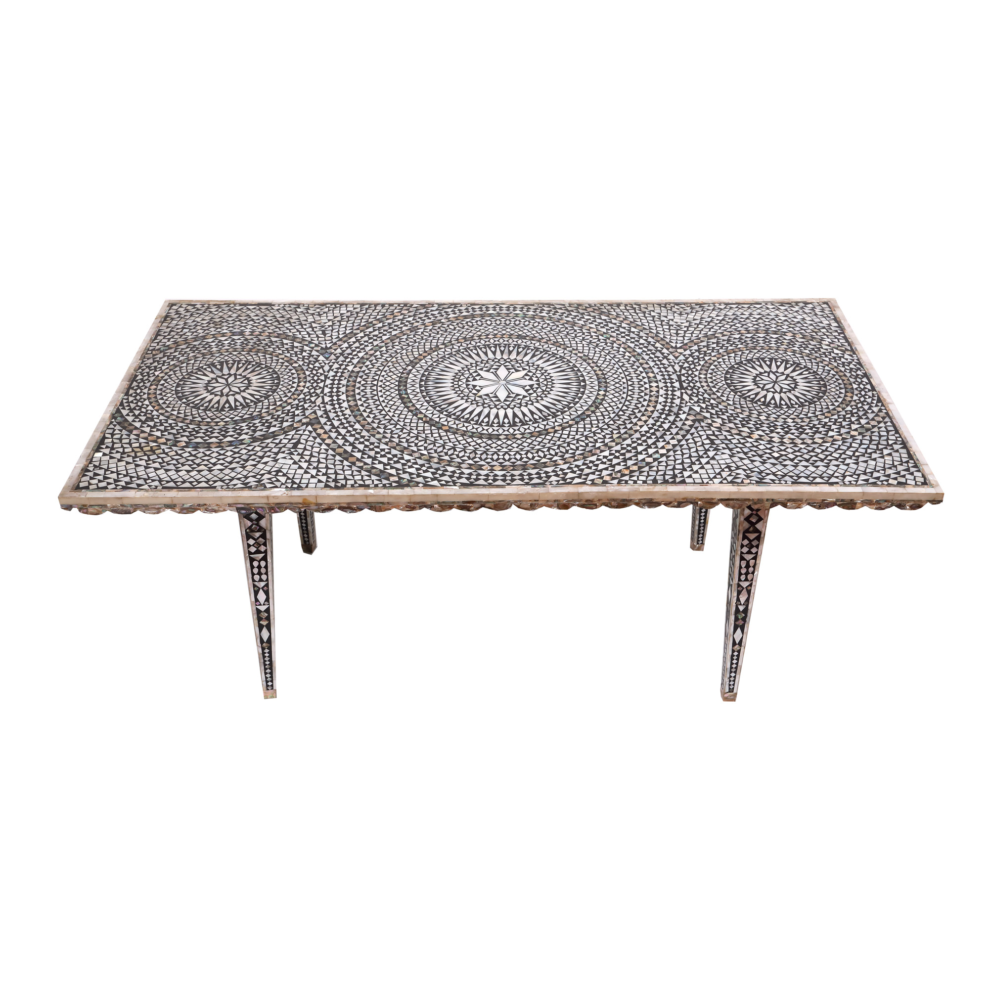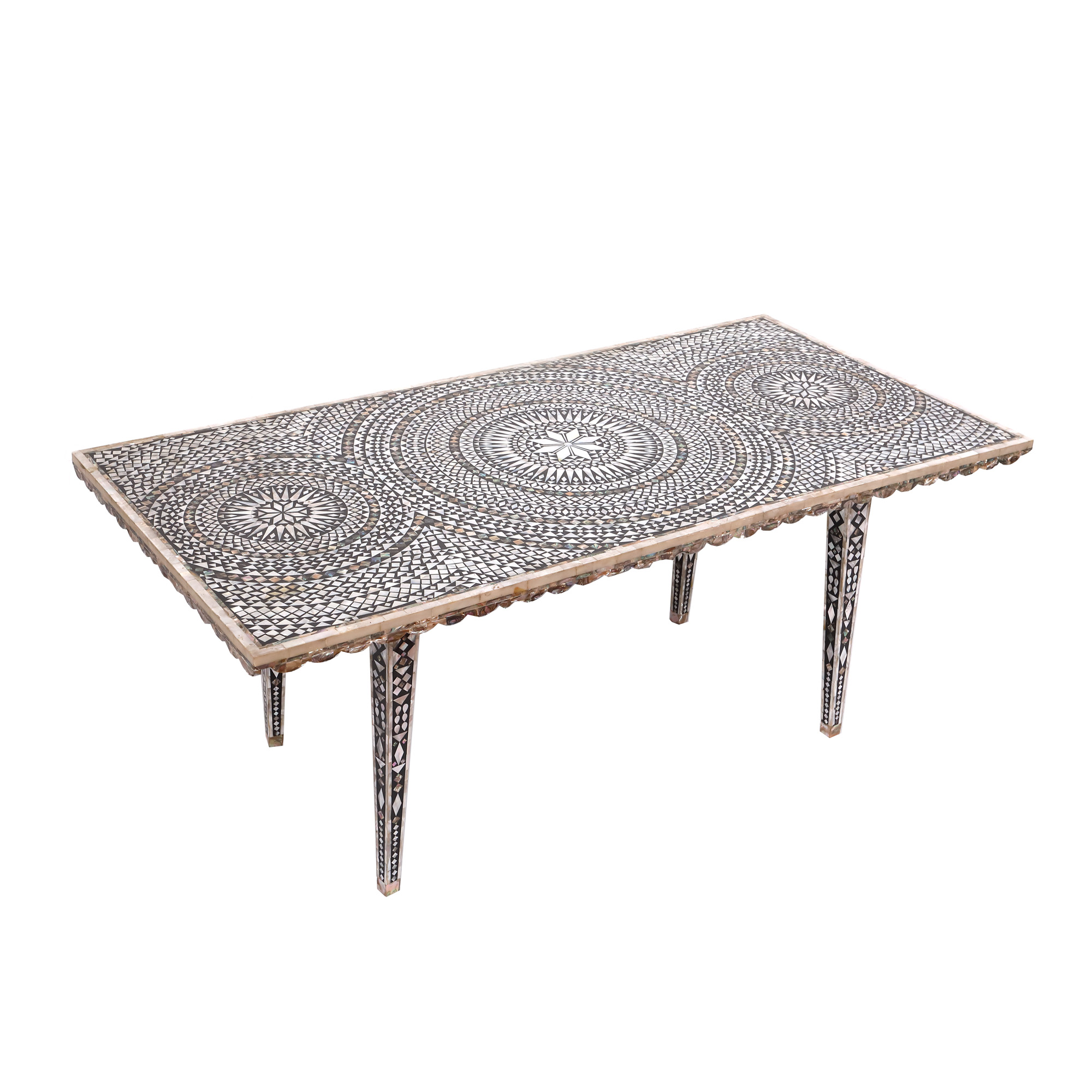 105. Frumoasă masă orientală cu intarsii din sidef, Iran, sfârșitul anilor 1970, cadou protocolar primit de Nicolae Ceaușescu, posibil din partea Șahului Mohammad Reza Pahlavi, însoțită de certificat R.A.A.P.P.S.