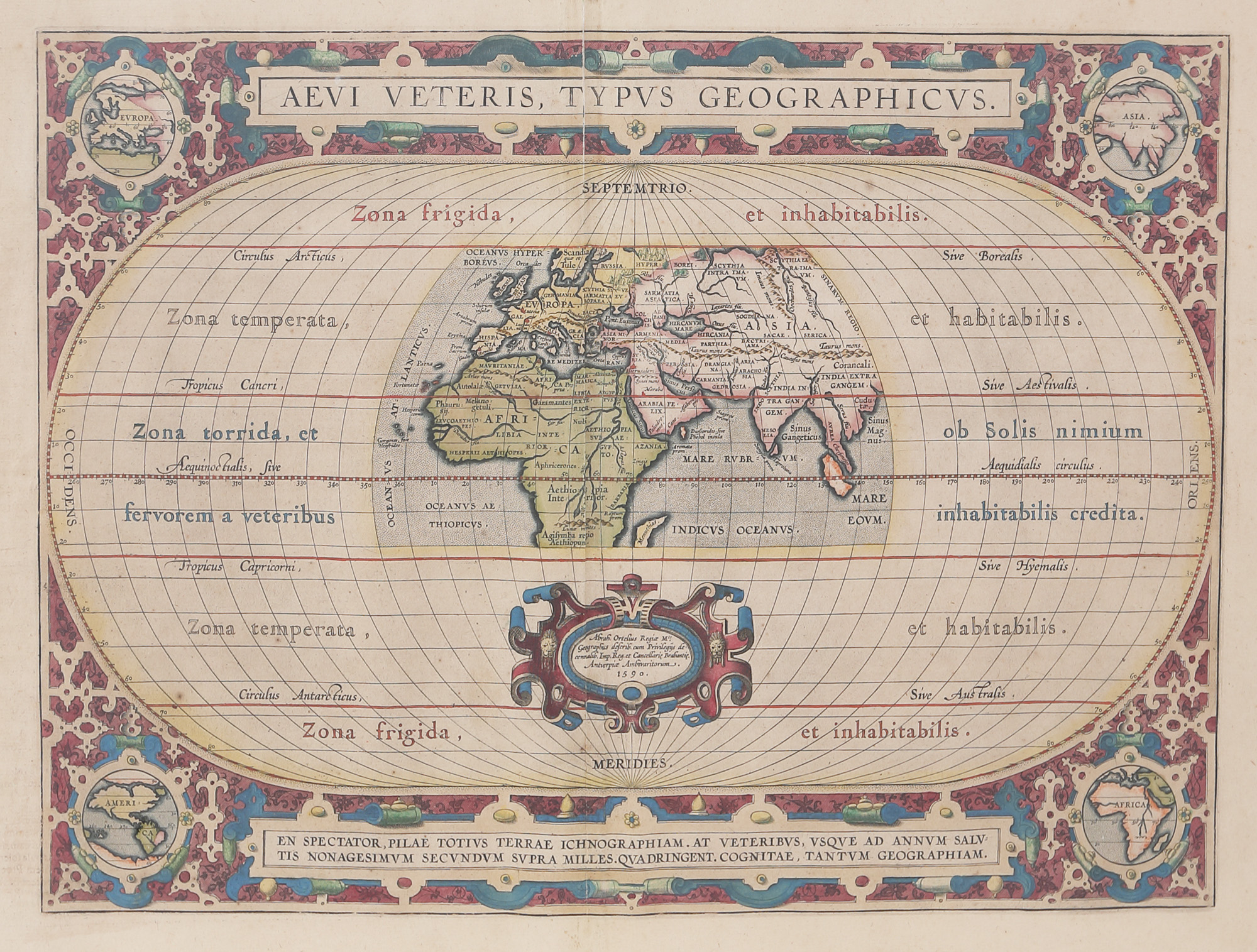 93. Hartă ”Lumea anticilor, inspirată de geografia lui Ptolemeu”, de Abraham Ortelius, ediţia Parergorn, Antwerp, 1590, piesă rară, de colecție