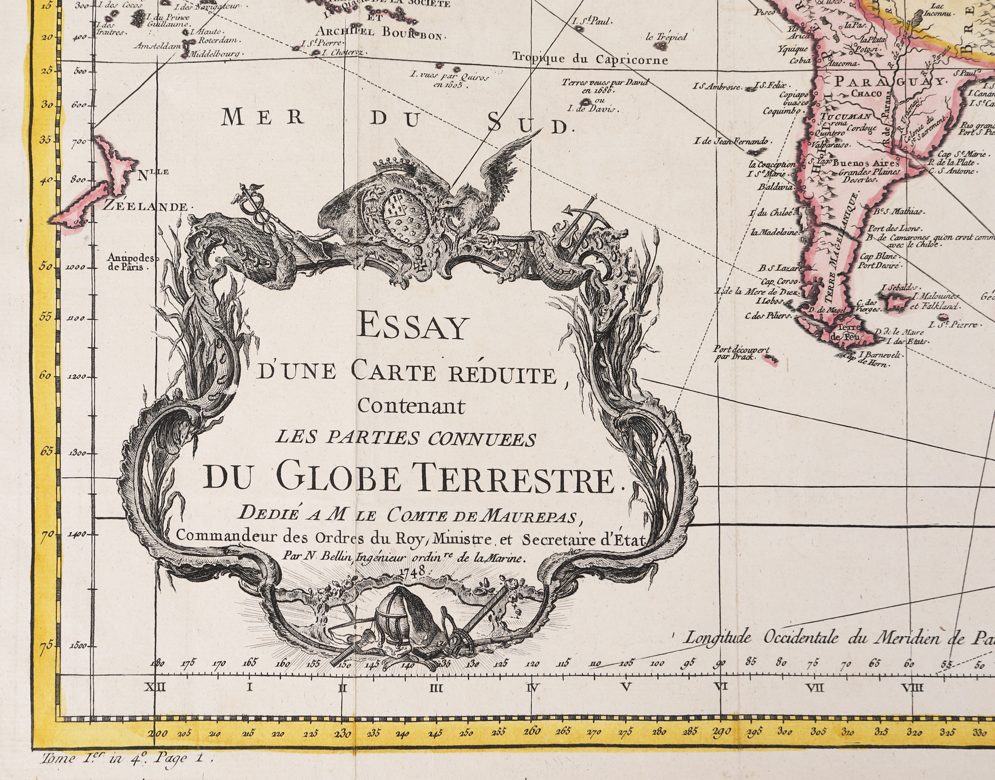Francezul Jacques Nicolas Bellin (1703-1772) a fost un inginer și geograf care și-a început cariera publică în funcția de inginer naval. Pasionat de călătorii și geografie, și-a dedicat activitatea acestui din urmă domeniu. A devenit unul dintre susținătorii mișcării Iluministe franceze, ceea ce i-a sporit popularitatea în mediile intelectuale ale epocii. Gravură pe cupru colorată manual după imprimare.