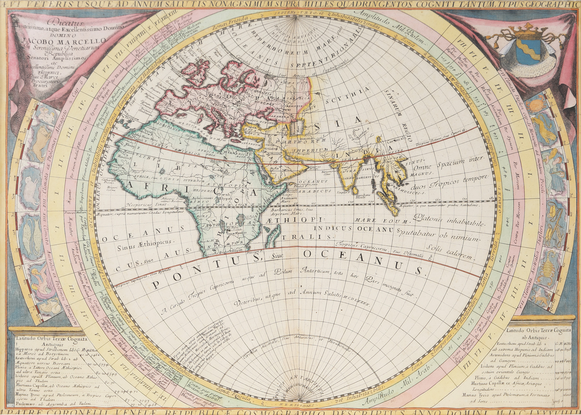 Cartograful și editorul venețian Vincenzo Maria Coronelli (1650-1718) a creat pentru regele Franței Ludovic al XIV-lea două splendide globuri, unul terestru și celălalt al bolții cerești, precum și numeroase alte piese similare aflate astăzi în importante colecții muzeale din Europa. El mai este cunoscut și datorită publicării unui Atlas Venețian în 13 volume. Piesa de față era dedicată lui Jacobo Marcello, nobil venețian, mecena și om de litere.