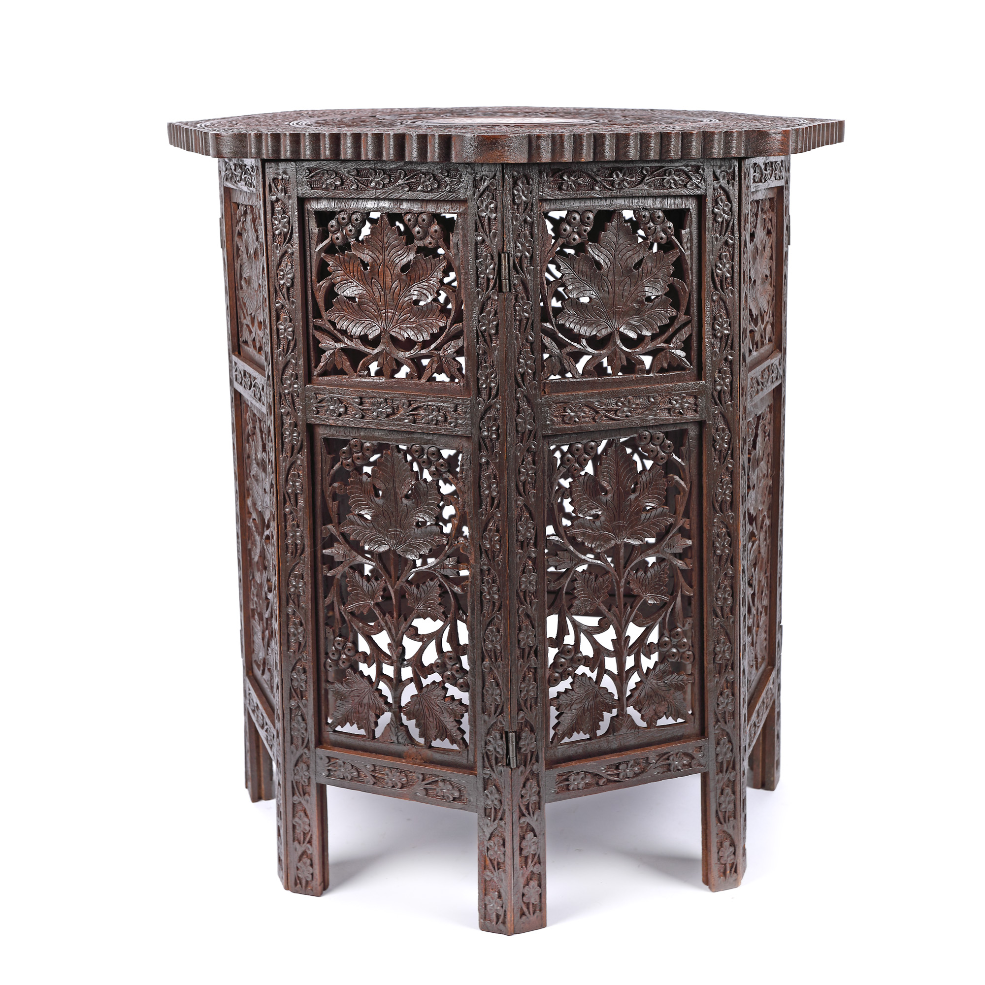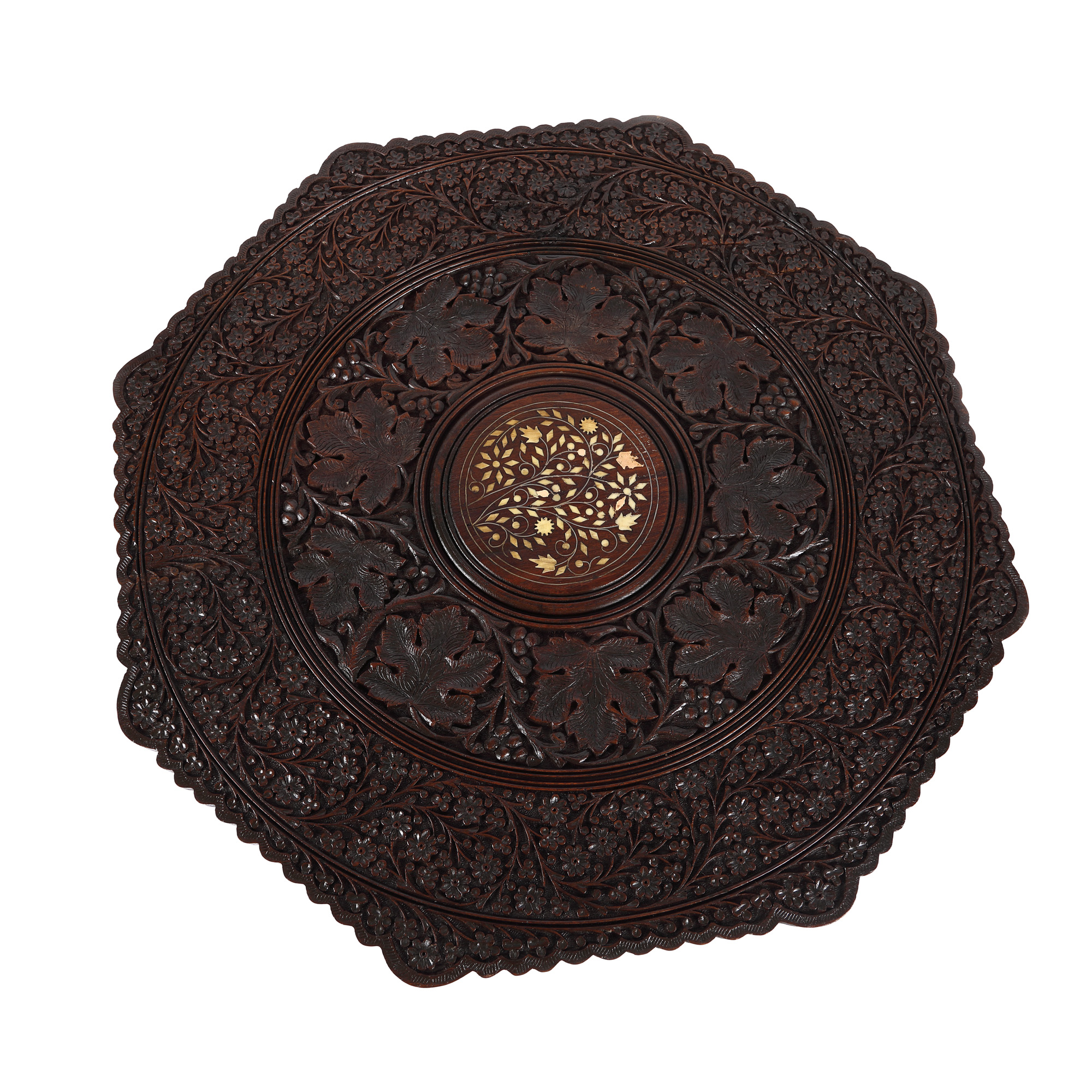 103. Măsuță octogonală din lemn exotic și intarsii din sidef, decorată cu viță de vie și alte motive florale, India, prima jumătate a sec. XX