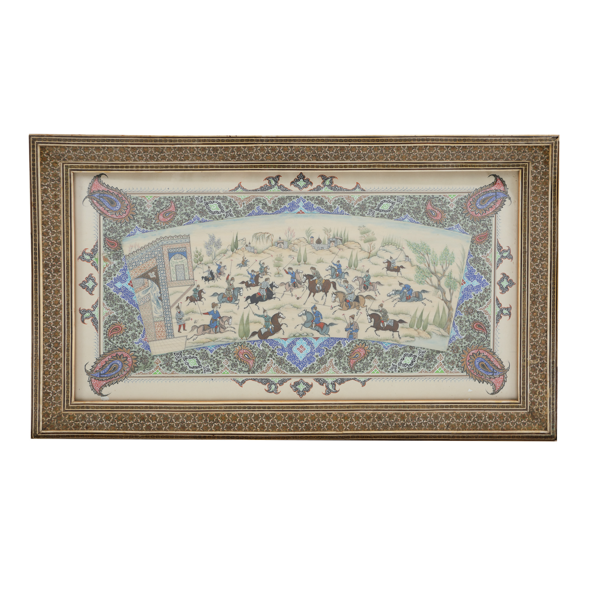 135. Miniatură persană, pictată pe os, reprezentând scene de vânătoare, prima jumătate a sec. XX