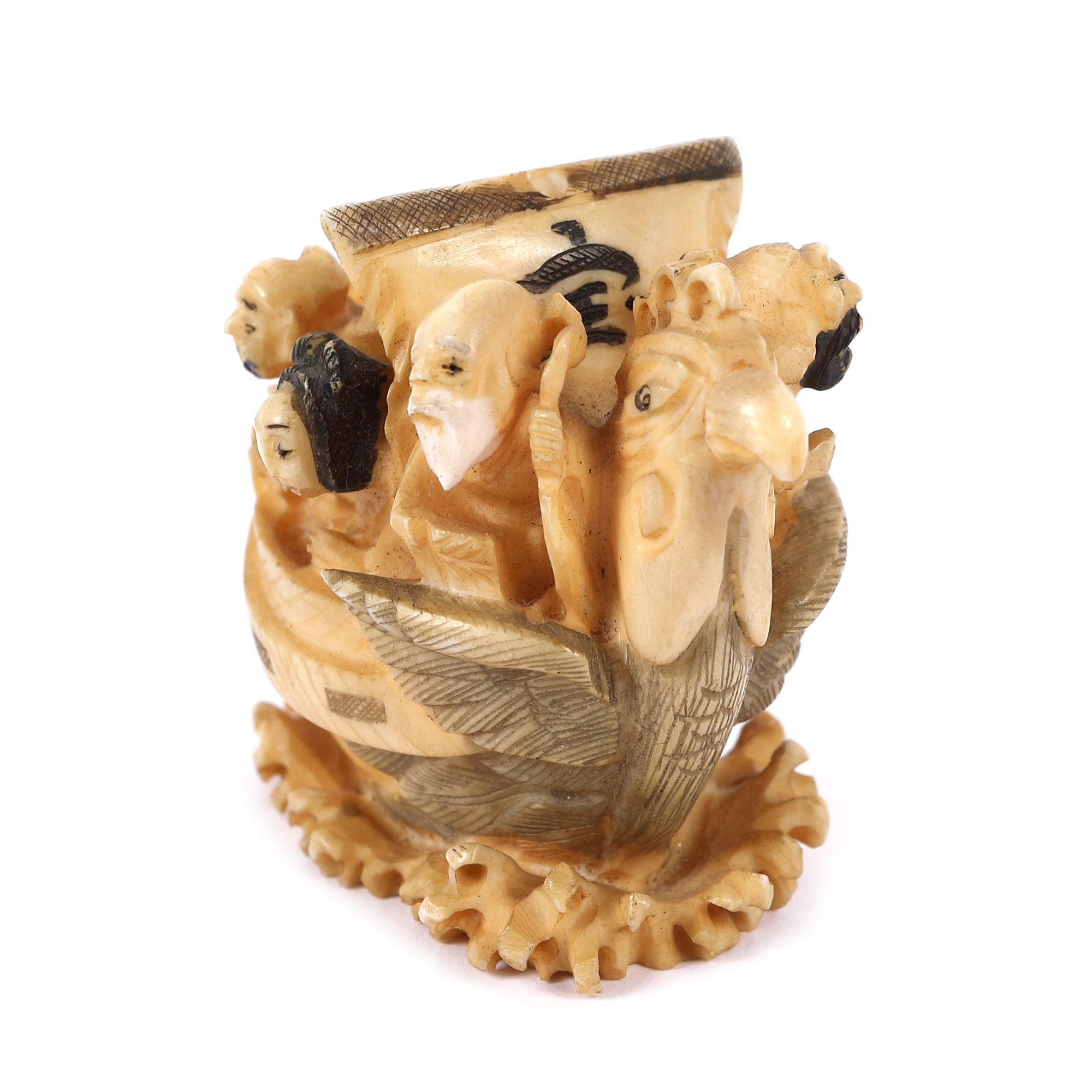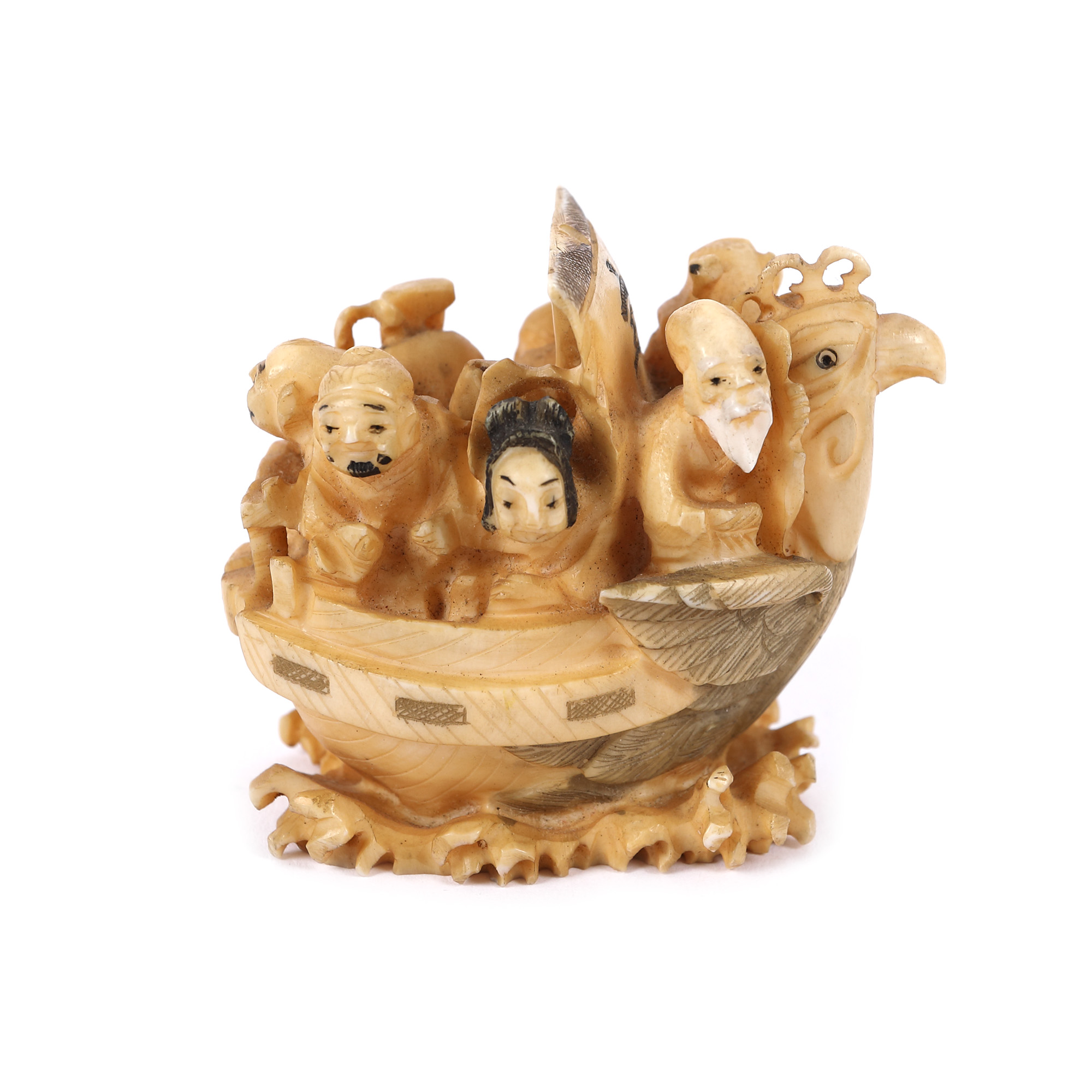 172. Netsuke din fildeș, reprezentând barca celor șapte zei ai norocului, sec. XIX