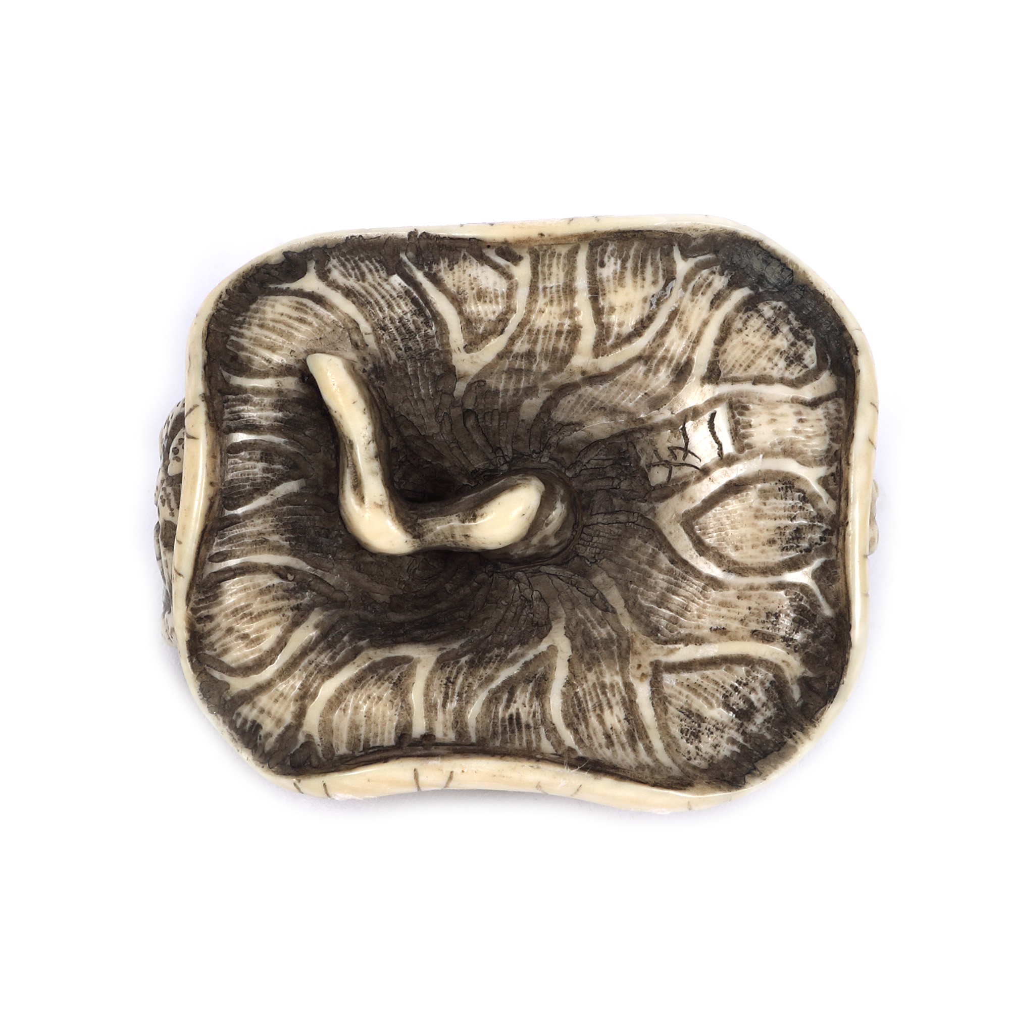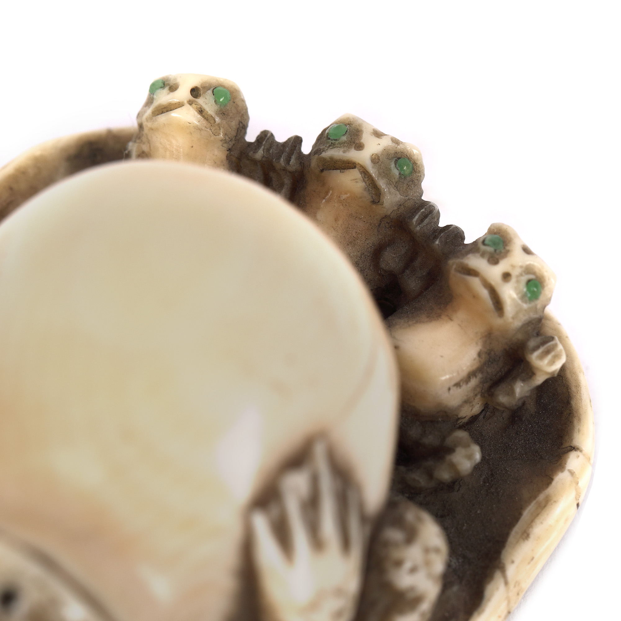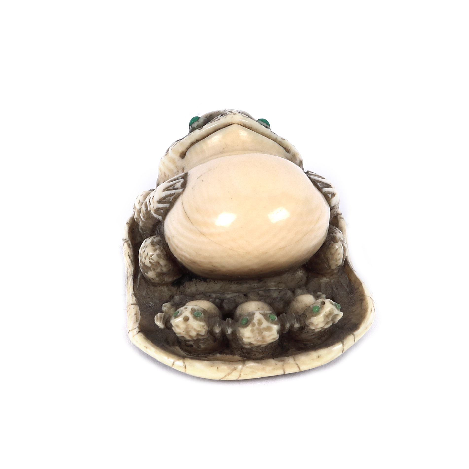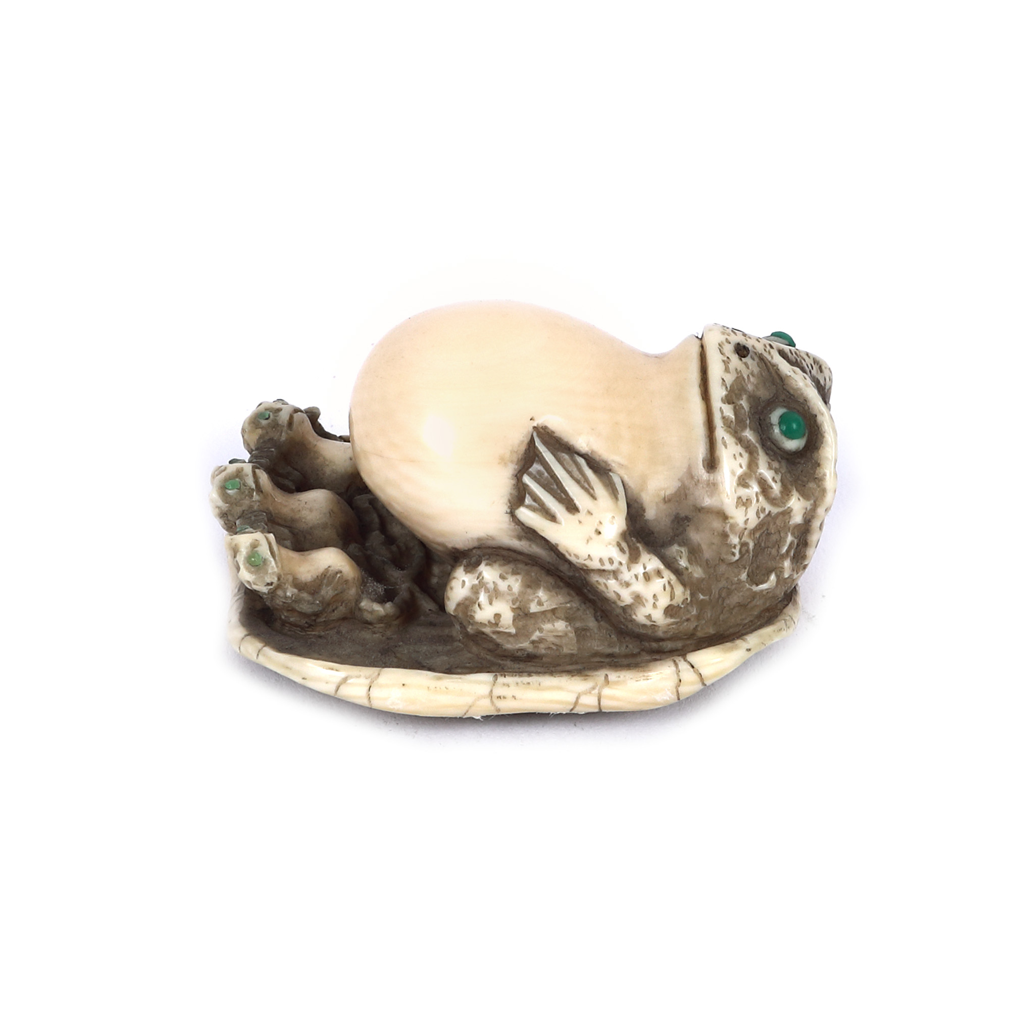 143. Netsuke din fildeș reprezentând o broască cu pui pe o frunză, semnat Tomokazu, perioada Edo, Japonia, sec. XIX