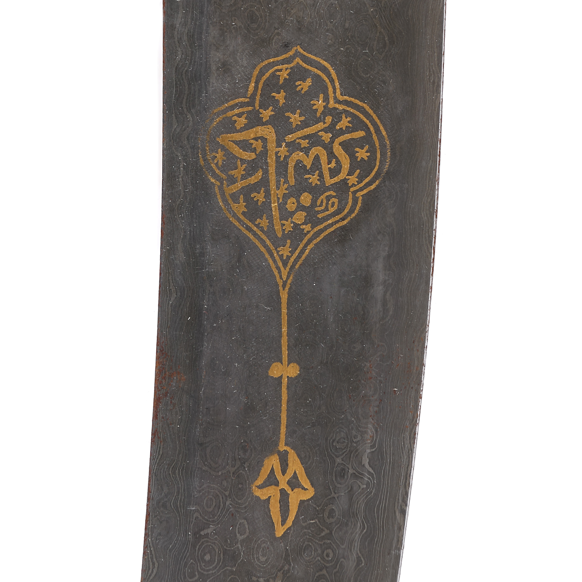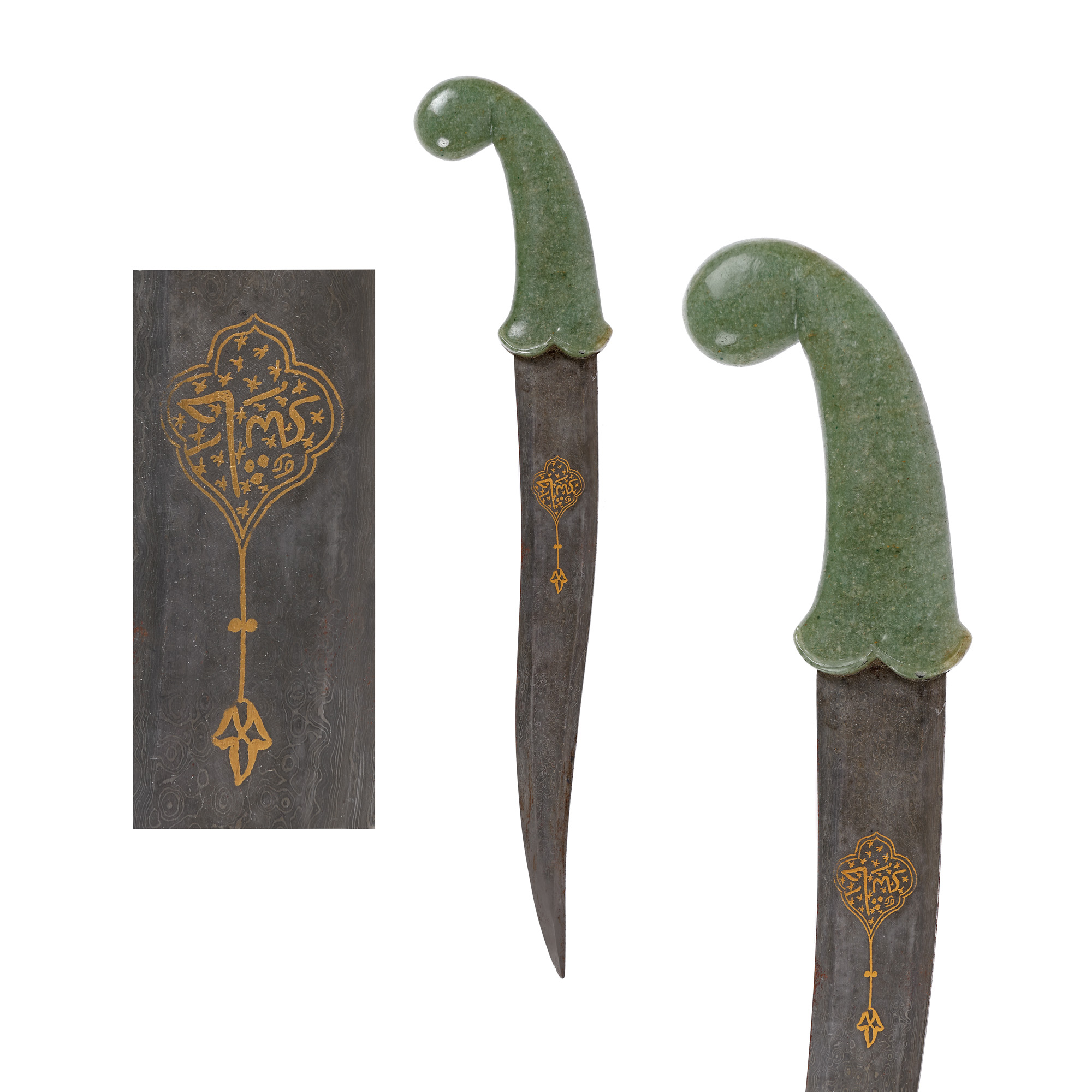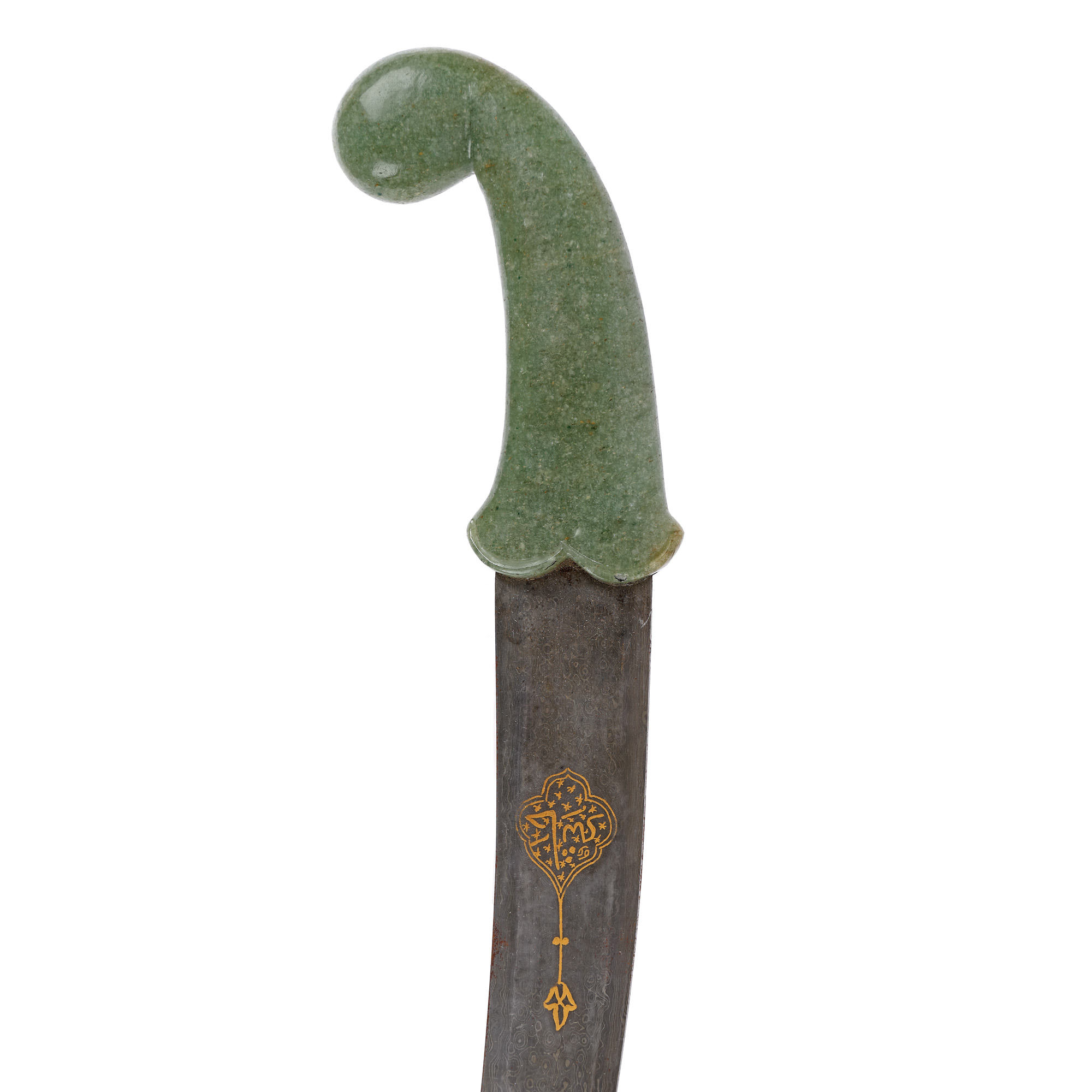 76. Pumnal Djambia, India, cu mâner din jad și lamă intarsiată cu aur, începutul sec. XX
