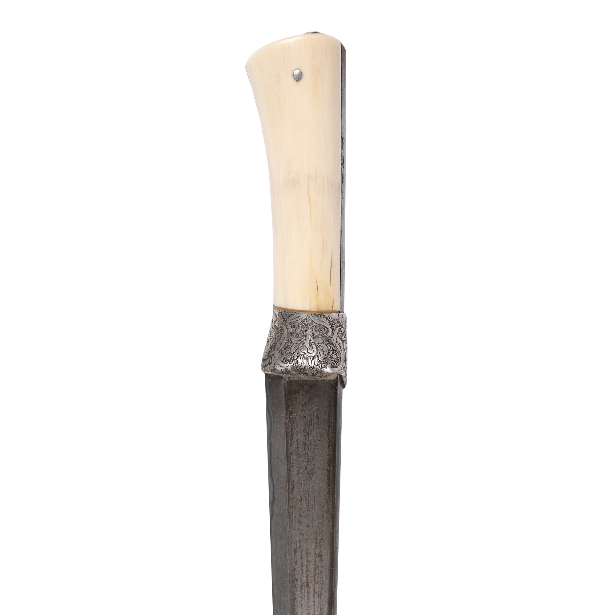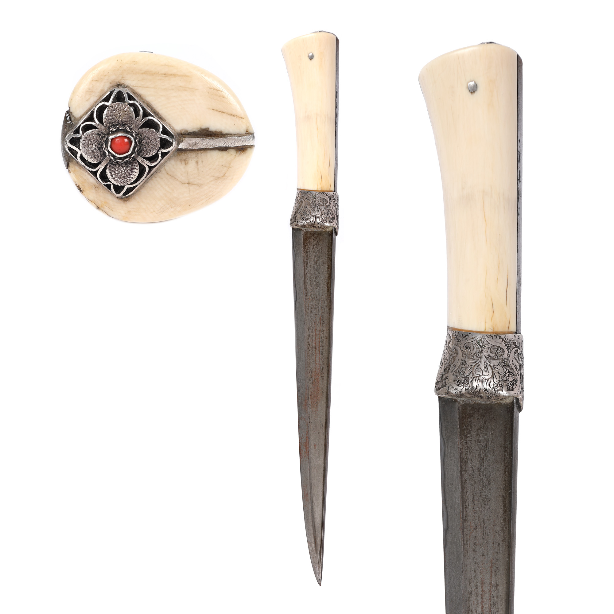 74. Pumnal persan Kard, cu mâner din argint și fildeș, decorat cu coral, sec. XIX, piesă rară, de colecție