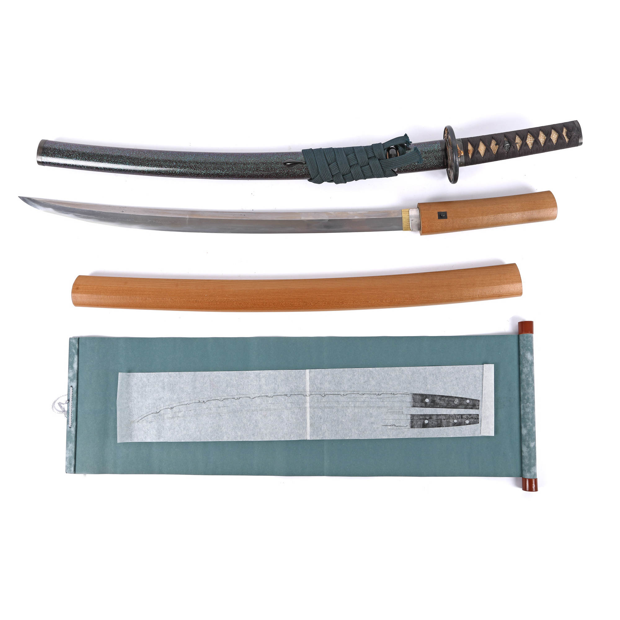 oțel tamahagane, piele de pisică de mare, saya din laque de Chine