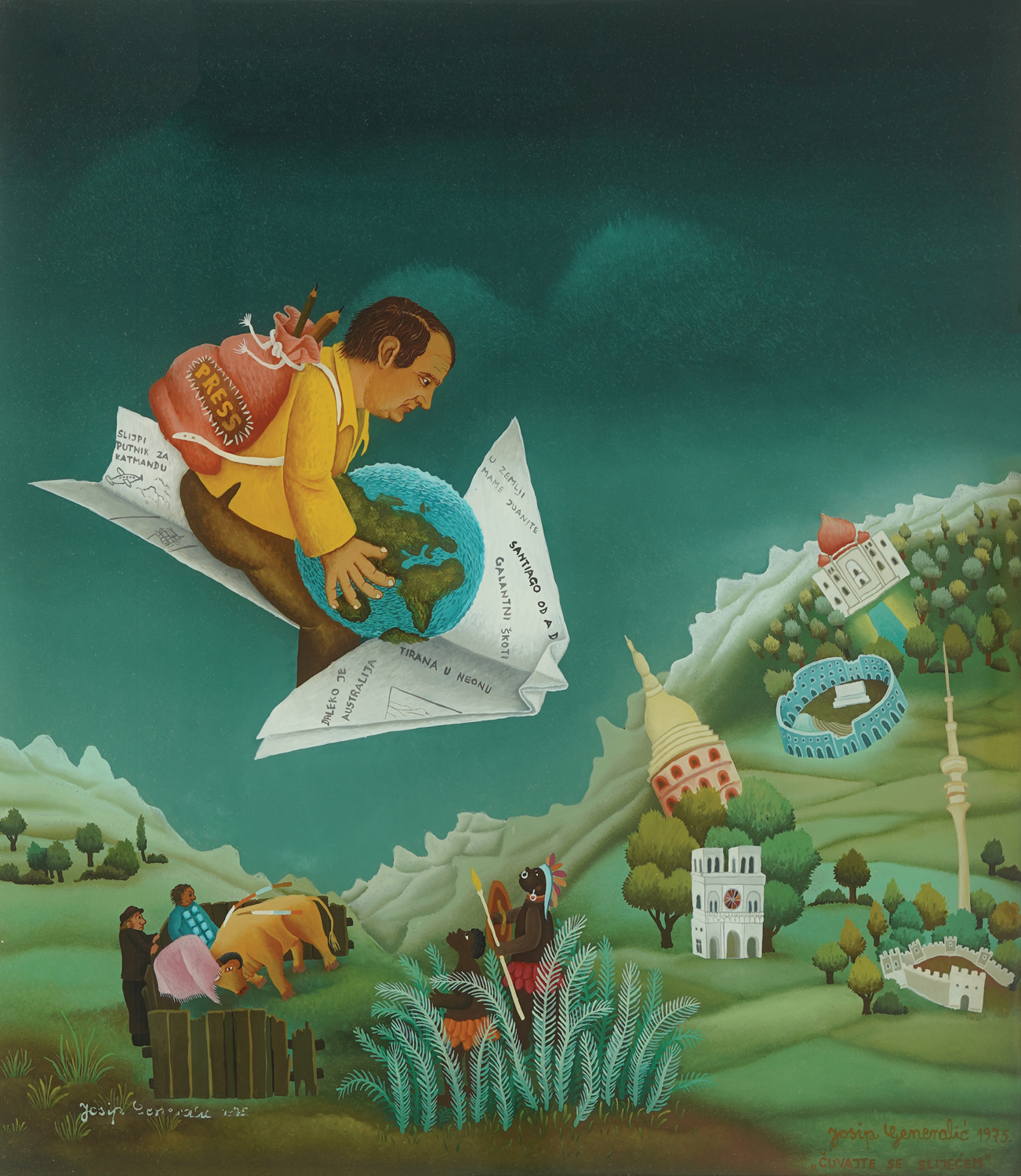Signed, dated and titled lower right, in brown, "Josip Generalić 1975. / "BEWARE I'M LANDING""; signed and dated lower left, on the front side of the protective glass, in white, "Josip Generalić 1975"