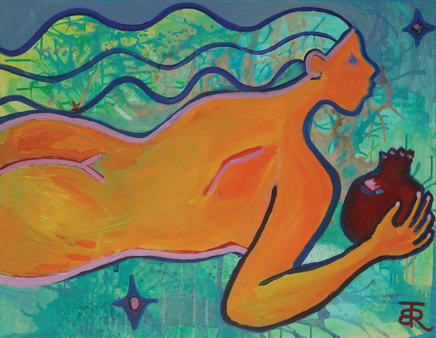 signed with initials at the bottom right, in red, "TBR"; signed, dated and titled on the back, in black, "TARA BEATA RACZ "GIRL WITH POMEGRANATE" 2025."