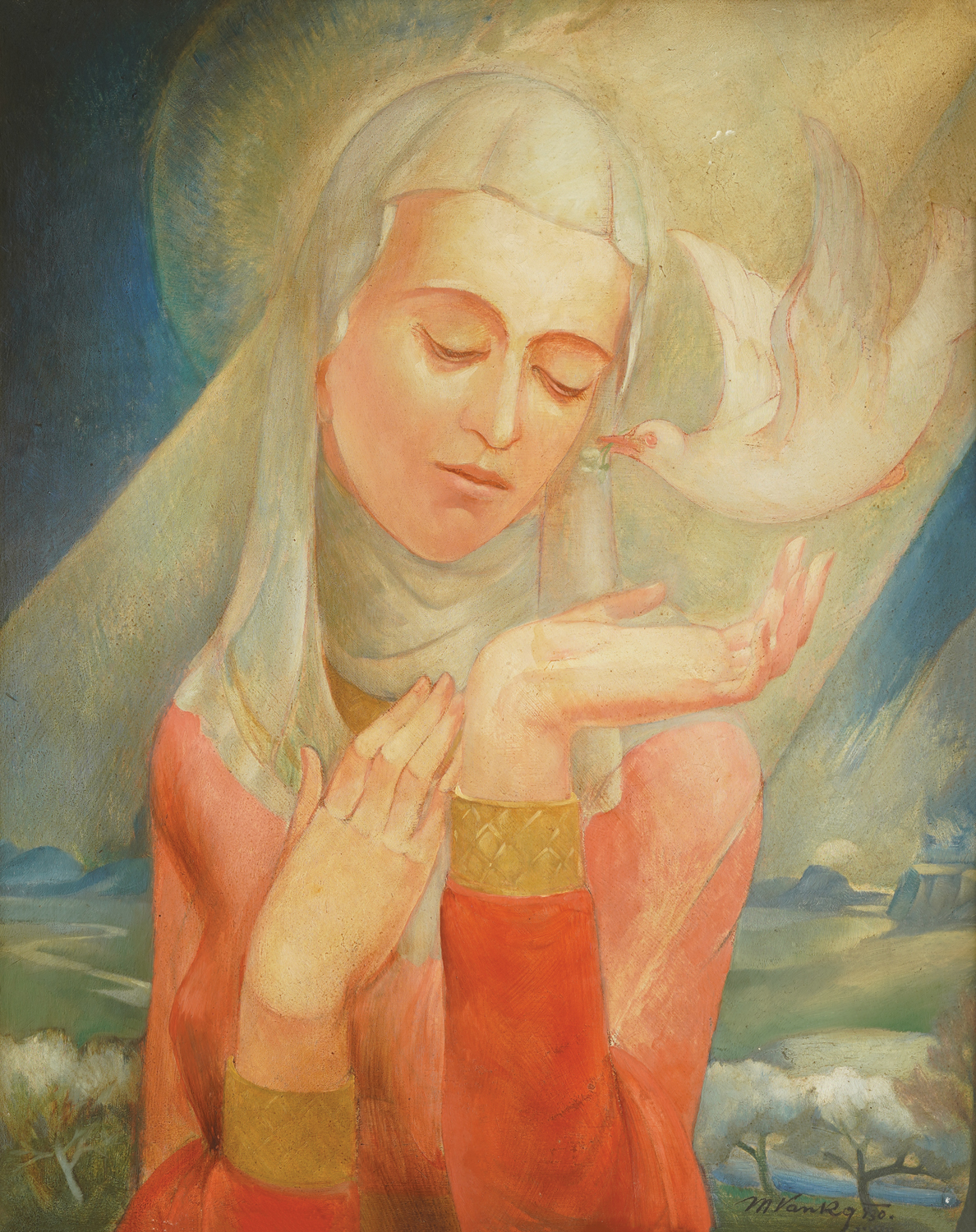 The opus of the painter Vanke, a graduate of the Brussels Académie des Beaux-Arts and a former professor of evening act, composition and fresco techniques at the temporary Higher School for Art and Crafts in Zagreb (1920. – 1936.), is filled with works that on the one hand exhibit "morphological nomadism" and a variable styling of the depicted plot, and on the other hand an undoubted artisan skill and the superior aesthetic values of his tonal palette of expressionist character. At the retrospective of Vanke's work held in 2002 at Klovićevi Dvori Gallery, which also included part of the opus realized after 1934 in New York and Bucks County (Pennsylvania), this was showcased with the brilliant oil portraits and watercolor scenes of Zagorje hills with small straw-roofed houses, painted at the end of the first decade and during the 20s of the last century. The exhibited fresco study belongs to the painter's Zagreb period and depicts a young girl who, with her eyes closed, extends her hand towards a white dove (Madonna?). It is signed with the year 1930 which suggests that the execution of the fresco was intended for the City Savings Bank in Zagreb. This is because the then director of the Savings Bank, Rudolf Erber, in 1930 ordered the painting of the walls of the restaurant "City Basement" from Vanke and his students from the fresco painting course, whose construction in the Savings Bank building was nearing completion. Vanke finished painting the restaurant's walls in 1932 and the restaurant was opened, and the City Savings Bank a year earlier, but we cannot document any possible Vanke fresco in its hall. BRP