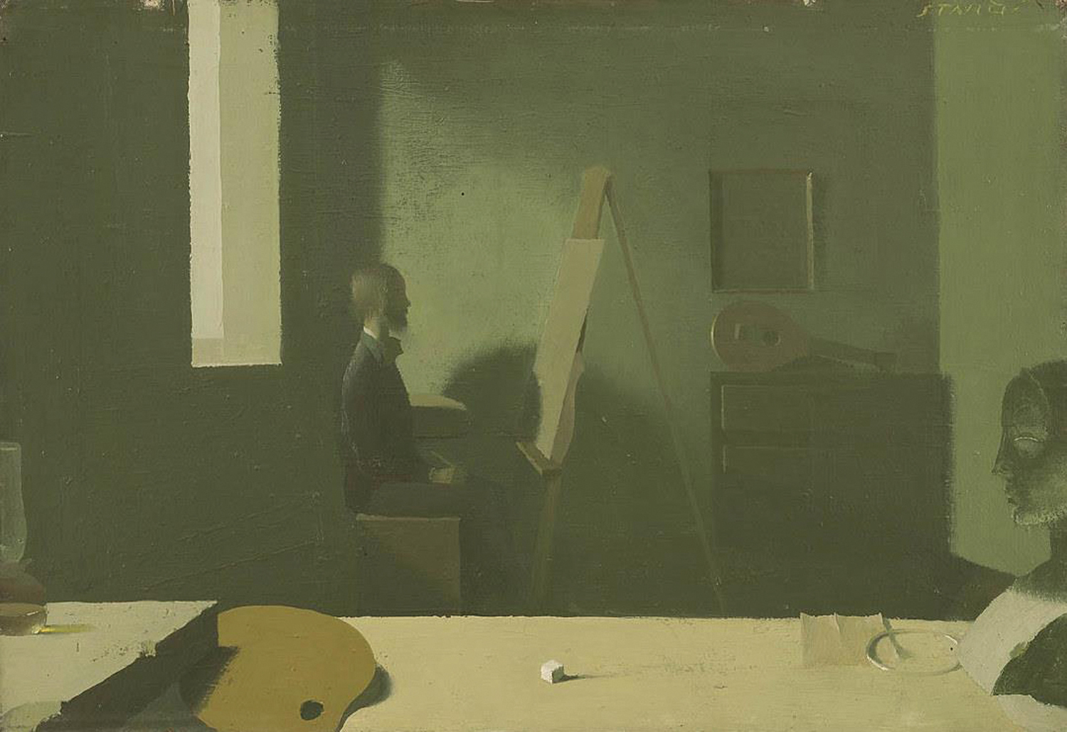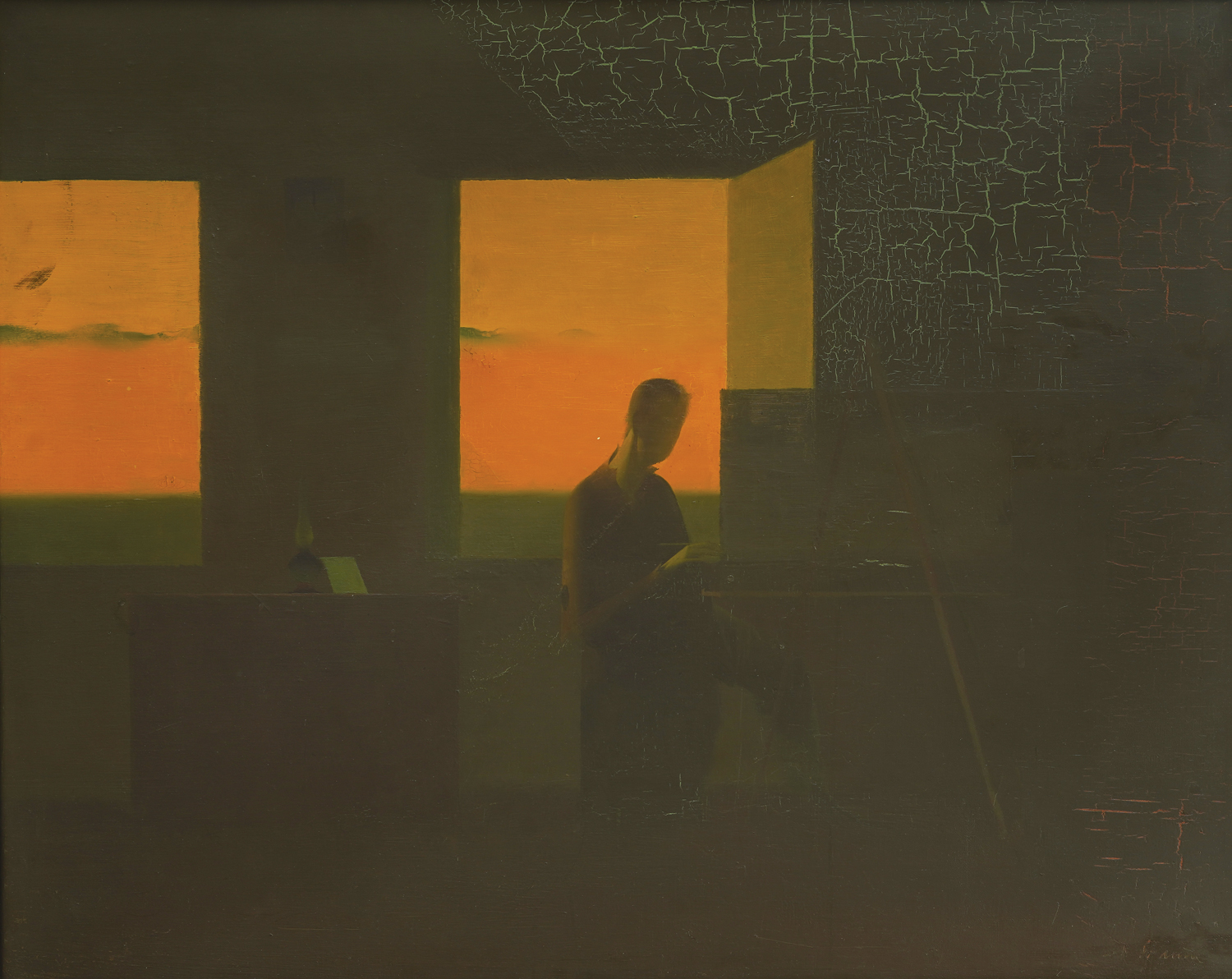 A pioneer of the post-war surrealist and fantastic painting in Croatia, Miljenko Stančić (Varaždin, 1926. - Zagreb, 1977.) graduated from the Academy in Zagreb and attended a graphics course with Tomislav Krizman. He created illustrations for newspapers, books and magazines, as well as wall paintings on the ceiling of the Croatian National Theatre in Varaždin. In the 1950s, he exhibited with Vaništa at the Museum of Arts and Crafts, and they were later joined by Ljubo Ivančić, Valerije Michieli, and Ivan Kožarić, who together formed the Group of Five. In his works, dream and reality, autobiographical and imaginary events under the aura of mysticism and surrealism were intertwined. Sometimes memories of his prematurely deceased older brother, whom Miljenko never met, would surface. Stančić is recognizable for his paintings of his native Varaždin – streets, squares, interiors. In the interiors, he often depicts the same motifs – a set table, a white tablecloth, a kitchen, an empty bedroom. For a period, he painted human figures as phantasmagoric metamorphoses in strangely lit interiors. The displayed oil on canvas depicts a typical Stančić chamber scene, a dark atmosphere, a man at a table or most likely at an easel. The artist's figure resembles a faceless doll. A single light source illuminates the melancholic painting and the gloomy interior, with an almost monochrome palette. The artist's silhouette is outlined by the light of an orange-red sunset or dawn coming in through the window.
