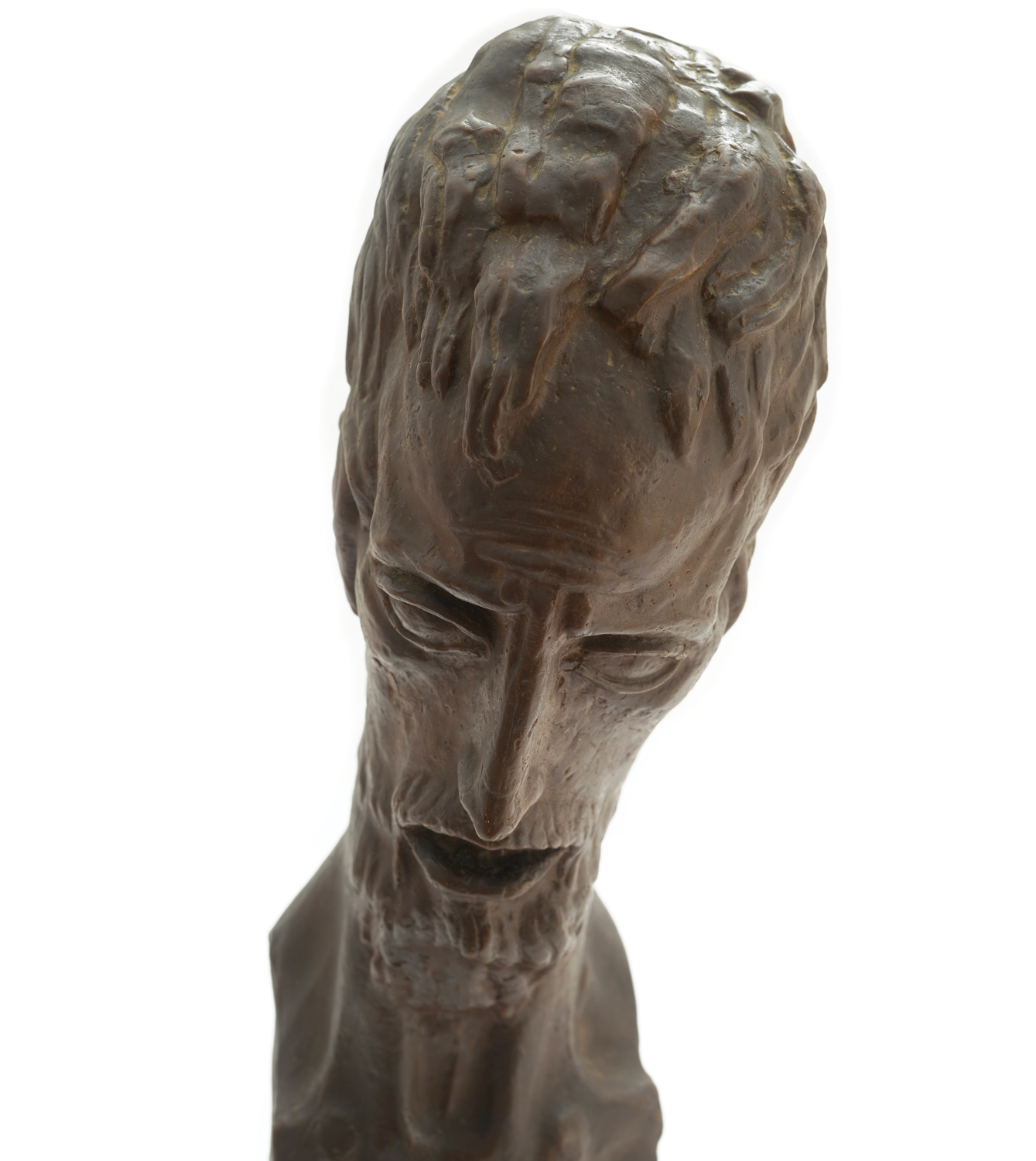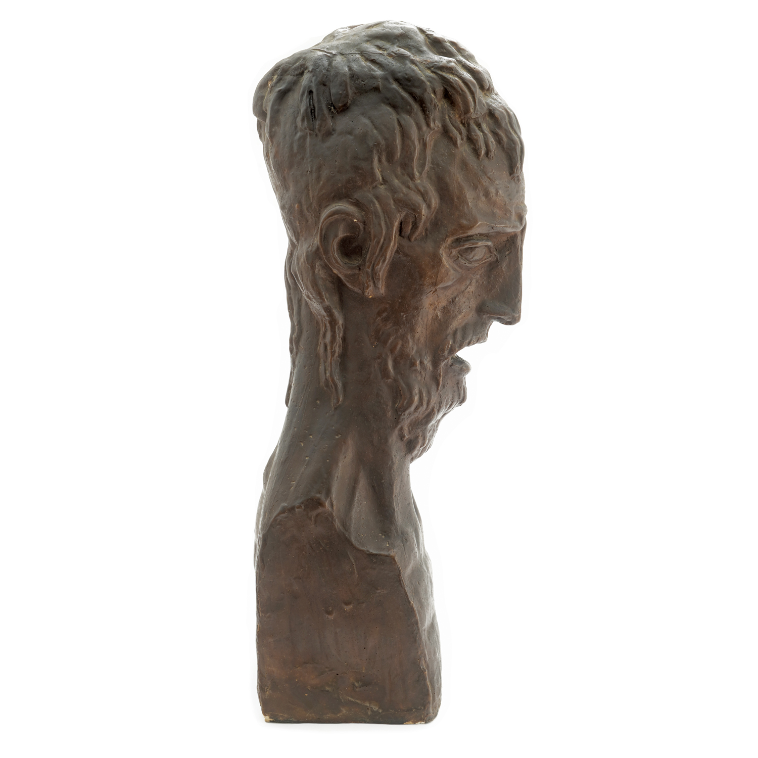 Ivan Meštrović is one of the most significant sculptors of the first half of the 20th century and the most famous Croatian artist of his time. He grew up in Dalmatian hinterland, and he began to engage in sculpture early on, showing exceptional talent that led him to enroll at the Vienna Academy of Fine Arts. Even during his student days, he stood out for his originality and strong sense for monumental form. After studying at the Vienna Academy and his first international successes, he asserted himself as one of the most important sculptors of European modernism. He participated in the Venice Biennale in 1911, where his works aroused great interest, and then lived and created in Rome, Paris and London. Through his life and work, his reputation extends far beyond European borders. His biography and artistic expression are inseparably linked to turbulent historical events - from the First World War, when he was also politically active, to his later emigration after the Second World War. He settled in the USA towards the end of his life, where he taught at the University of Notre Dame and left behind a massive sculptural heritage that is now preserved in numerous museums and public spaces. During the first decades of the 20th century, he shaped his most famous cycles of monumental works, such as the "Vidovdan Temple", in which he combines national motives with modernist form. Meštrović's sculpture from this period is characterized by strong pathos, emphasised spirituality and expressive gestics. His works combine elements of secession, symbolism and expressionism, with the figure taking on a universal significance and a strong emotional charge. A significant part of Meštrović's opus consists of works of sacral thematics. In the early 1910s, a series of sculptures with the theme of saints was created, such as the head of Jesus Christ or the offered plaster of John the Baptist, in which the expressionist spirit is clearly manifested. The offered head of John the Baptist was created in 1914 and comes from the not-too-small collection of Meštrović's works owned by the Signorelli family in Rome. This interesting collection includes over 40 works and was a gift from the sculptor to his long-time friends, documented in an article by Vesna Barbić. The ascetic face of John the Baptist exudes dramatic strength, highlighted contrasts and inner tension, while the roughly modeled facial surfaces reflect intense spiritual turmoil. Expressive sculptures demonstrate Meštrović's virtuosity in expressing universal human feelings through religious motives.