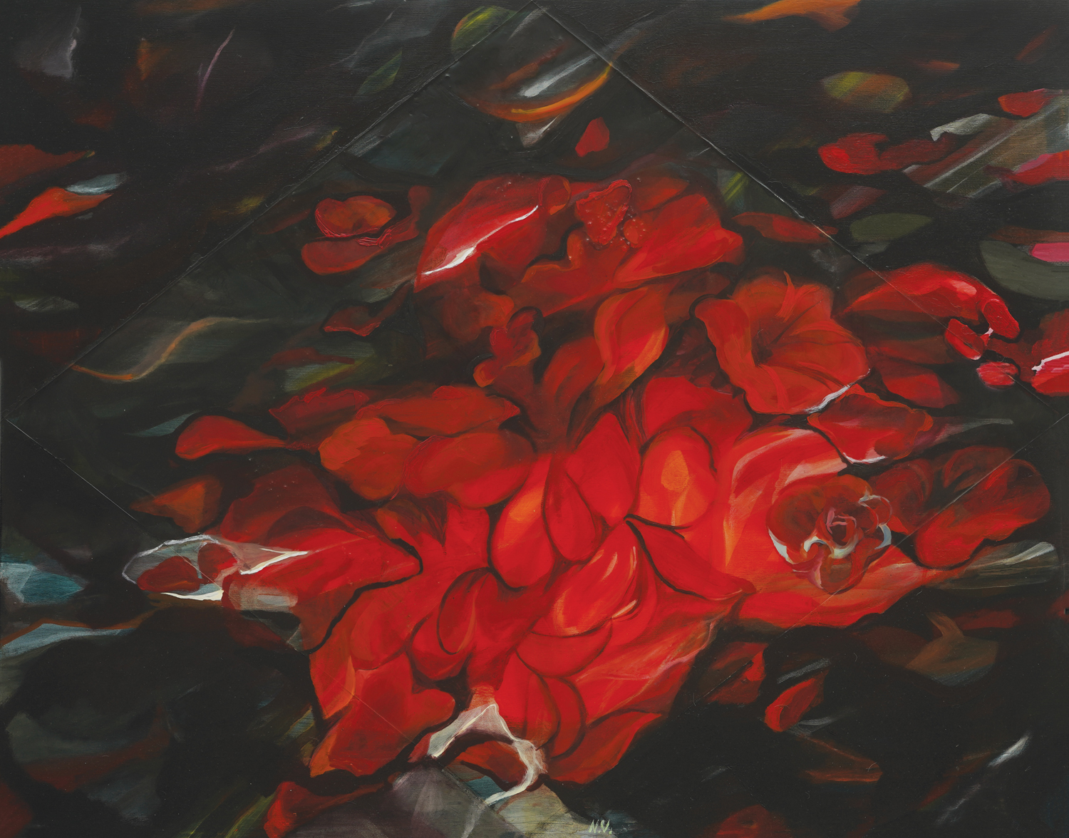signed with initials at the bottom in the middle, in white, "N.V."