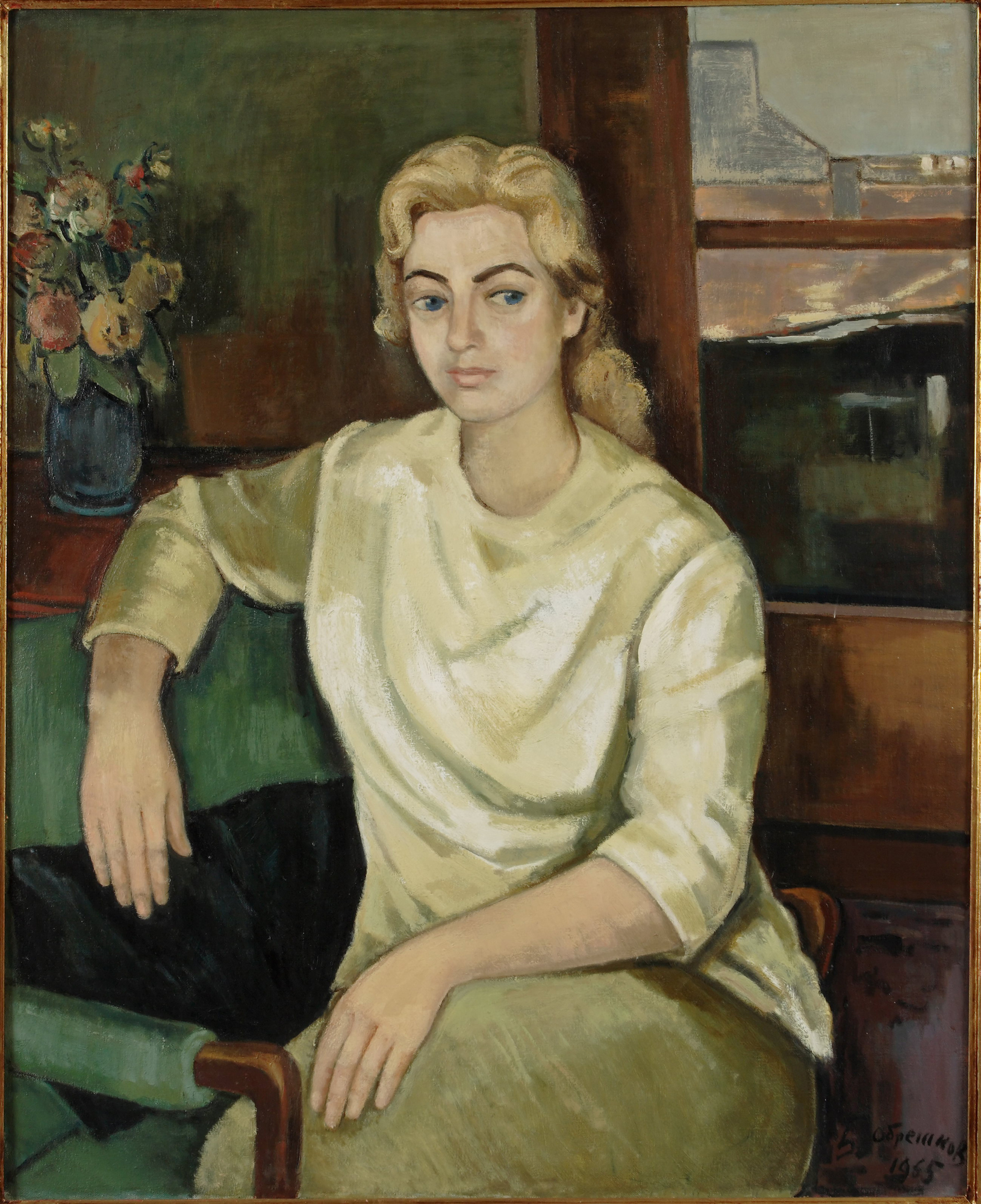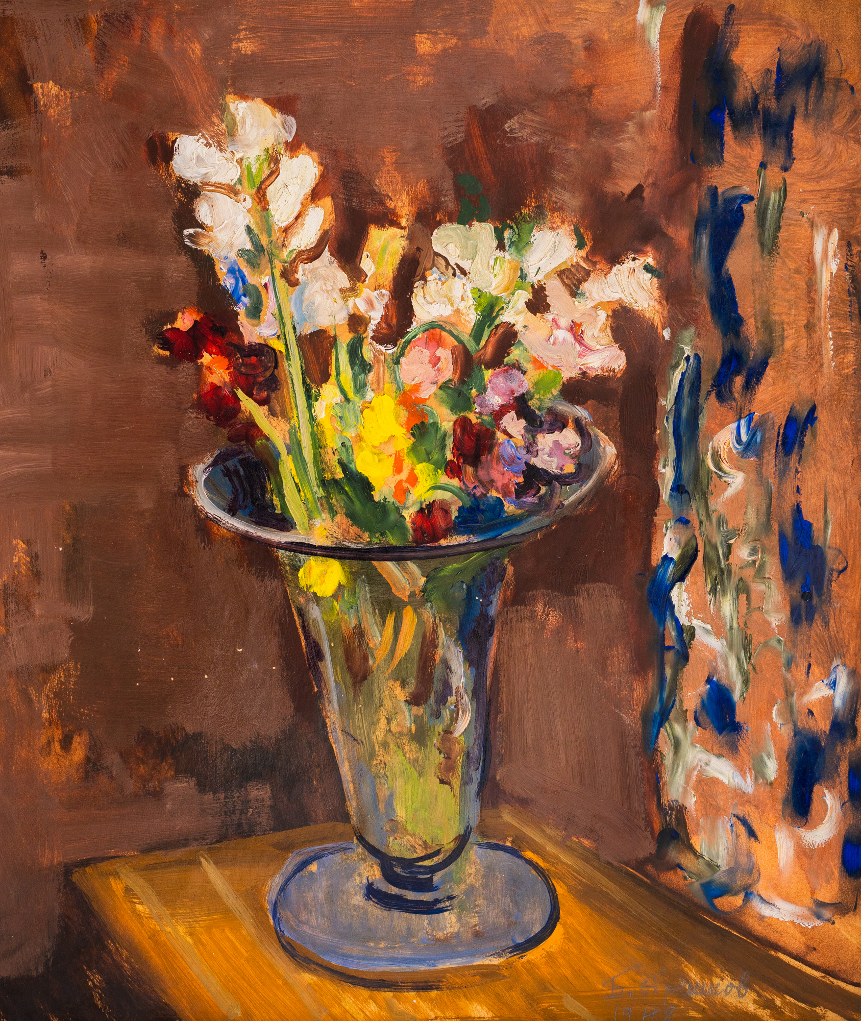 The painting "Bells and Daffodils" is emblematic of Bencho Obreshkov's style. The genre of still life is one of the most preferred by the artist. Throughout his creative career, he creates still lifes in which he solves various plastic tasks, and the main objects in them are vases with flowers, fruits and fish, placed in an interior space. The painting was bought by the author in the 1960s from the famous writer Lada Galina, with whom he had a long-standing friendship. In 1965, Bencho Obreshkov painted a representative "Portrait of the Poet Lada Galina" from nature, which is one of the highest achievements in his overall work. The 40s were a turning point for Bulgaria and for the personal destiny of artists. Some of the hallmarks of the 1930s are still valid in painting, and in particular the influence of expressionism and the new objectivity. "Bells and Daffodils" was created after Bencho Obreshkov's return from a creative business trip to Romania in 1946. The paintings created during this time were shown in the Bulgarian-Romanian exhibition in Bucharest and Sofia in 1947. After this visit, the color in his paintings became more dense and saturated . The artist confidently enters the mature period of his work. In 1948, Bencho Obreshkov painted the remarkable "Still Life with a Glass Vase", executed entirely in the spirit of painting from the 1930s. The color is expressive, the brushwork is free and bold, the still life is placed in an interior space hinted at by the colorful curtain. The flowers are springy, fresh and unpretentious - probably freesias in white, yellow and pink. The vase is transparent glass, in a typical Art Nouveau style in the form of a tulip with a round seat. The same glass vase is also present in a work painted the following year - "Vase with Flowers", 1949, oil on canvas, 45x37 cm. The motif with the flower curtain in the right part of the canvas also appears in another earlier still life - " Flowers", 1945, oil paints, canvas, 55.5 x 46 cm from the collection of the National Gallery, Sofia. The drapery ornaments are the most artistic part of the canvas. Dynamic brushstrokes in ultramarine, white and green applied with bold brush strokes are positioned vertically on a tile-ochre fabric. The interior space is immersed in the same tone as the general background in the room is conditioned and alive. It envelops and unites the entire composition in a rich and noble harmony of local tile and golden tones. The overall impact of the work is dynamic, modern and emotionally charged. The painting took part in a large-scale retrospective exhibition of Bencho Obreshkov, on the occasion of one hundred and ten years since his birth, at the National Gallery - Palace from April 23 to May 24, 2009. It was published in the catalog accompanying the exhibition and in Kiril Krastev's monography from 1982. (S.N.)