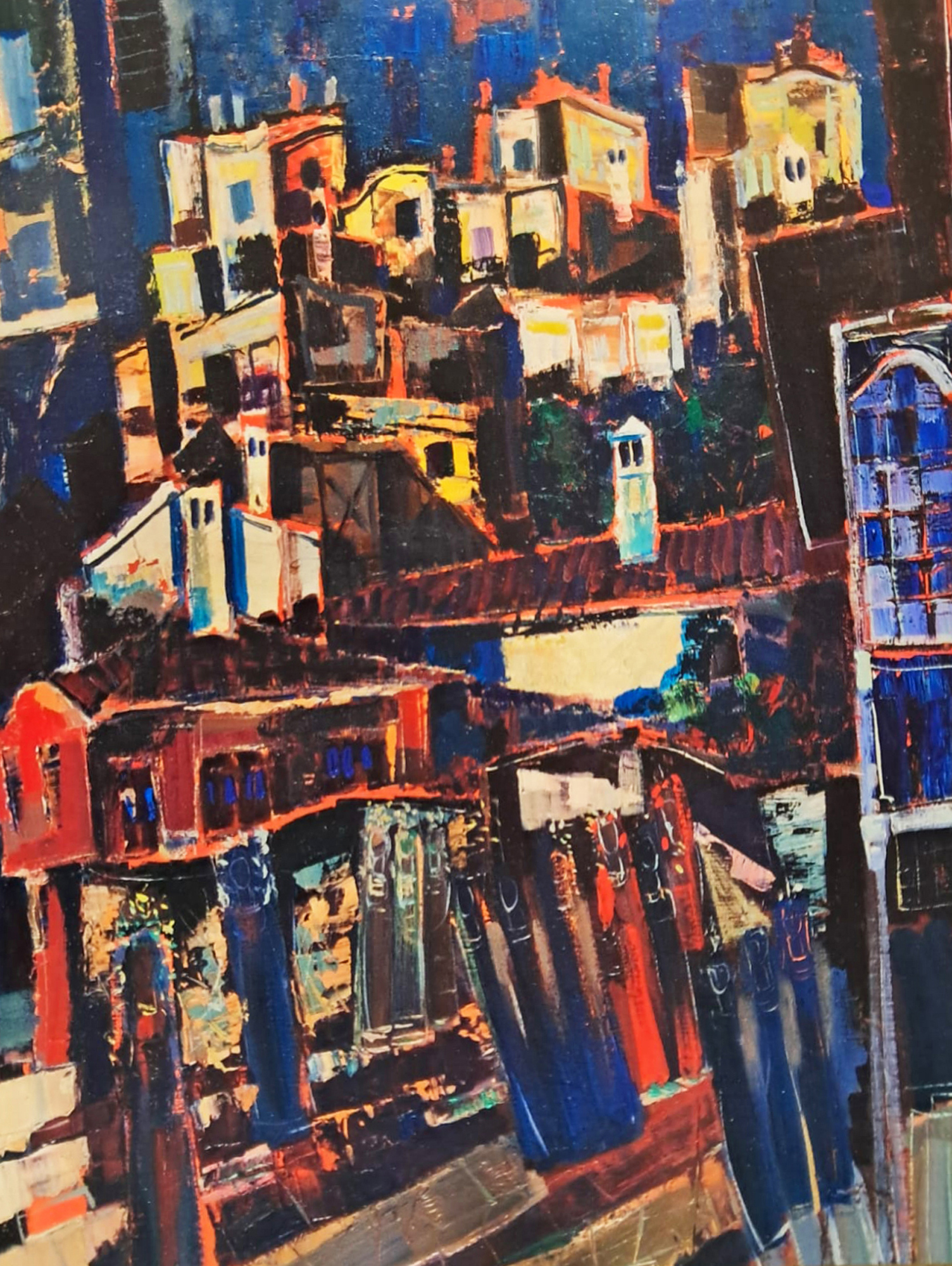 Dimitar Kirov - DiKiro was born on May 20, 1935 in Constantinople, Turkey. In 1959, he completed monumental and decorative painting under Prof. Georgi Bogdanov at the Art Academy. In the 1960s, Dimitar Kirov together with artists such as Encho Pironkov, Georgi Bozhilov - Slona, ​​Hristo Stefanov, Ivan Kirkov, Lyuben Dimanov and Ioan Leviev was part of a group of Plovdiv artists who were perceived as mediators of Western artistic influences in art. They are distinguished not only by their eccentricity and provocativeness, but also by experimental innovation, being a kind of counterpoint to the established artistic and painting practices of the period. We can see exactly such ideas in Kirov's oil painting from the 1980s "The Kiss of Old Houses". The complex composition presented with a rich palette of colors and shapes shows the impressionist and expressionist influences on the artist, as well as the abstract architectural motifs that are characteristic of his work of the period. The combination of bright colors such as green and red on the black background create the feeling of depth, and the blue accents emphasize the shape of the old Plovdiv houses in the background. Compositionally, the artist directs the viewer's gaze through thick lines that start from the bottom of the canvas to the center of the painting, which creates the feeling of a monumental urban landscape, with a street that takes us to the heart of the Old Town of Plovdiv. A similar oil and large-format landscape of old Plovdiv from the same period is "Plovdiv Rhythms", in which DiKiro again depicts his ideas about the city, rather than literally recreating reality. However, in that artwork there are clearly defined architectural forms of the old houses, the spaces between them and the road to them. The idea of ​​monumentality of an idealized idea of ​​the artist's beloved Plovdiv remains the same as it is in "The Kiss of Old Houses" - the dark blue plan combined with red, yellow and green accents creates an image of a fantastic and spectacular place that can only exist in the dreamy cityscapes of Dimitar Kirov. (M.Z.)