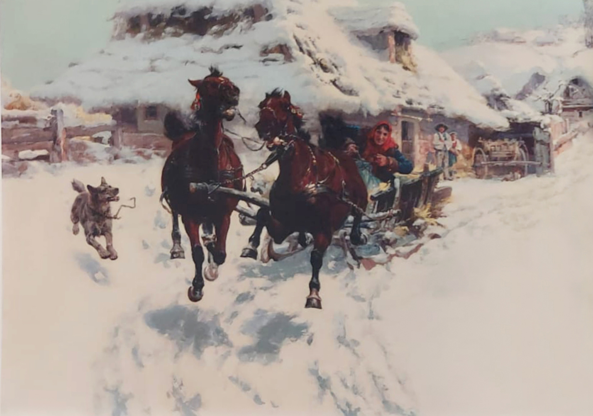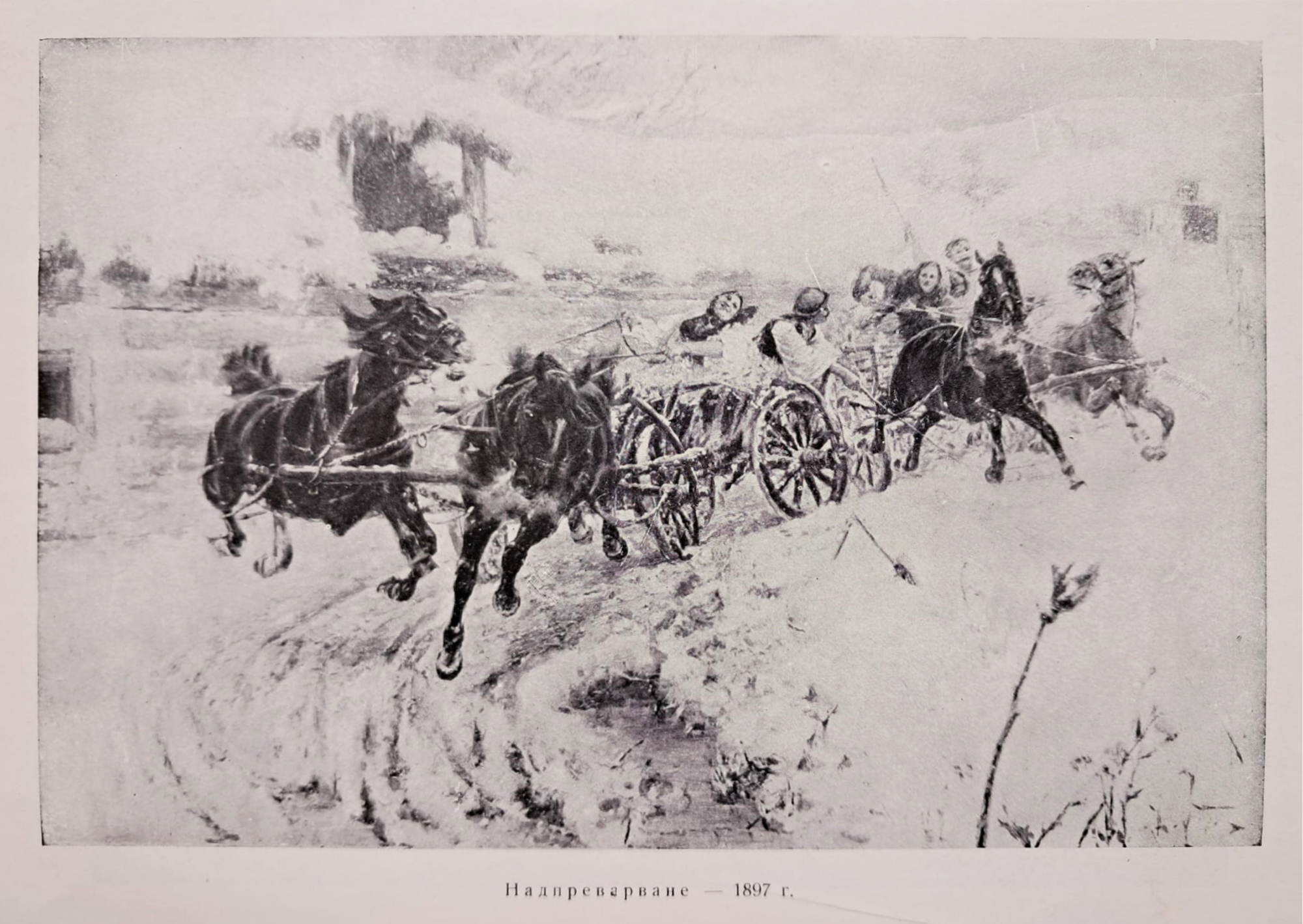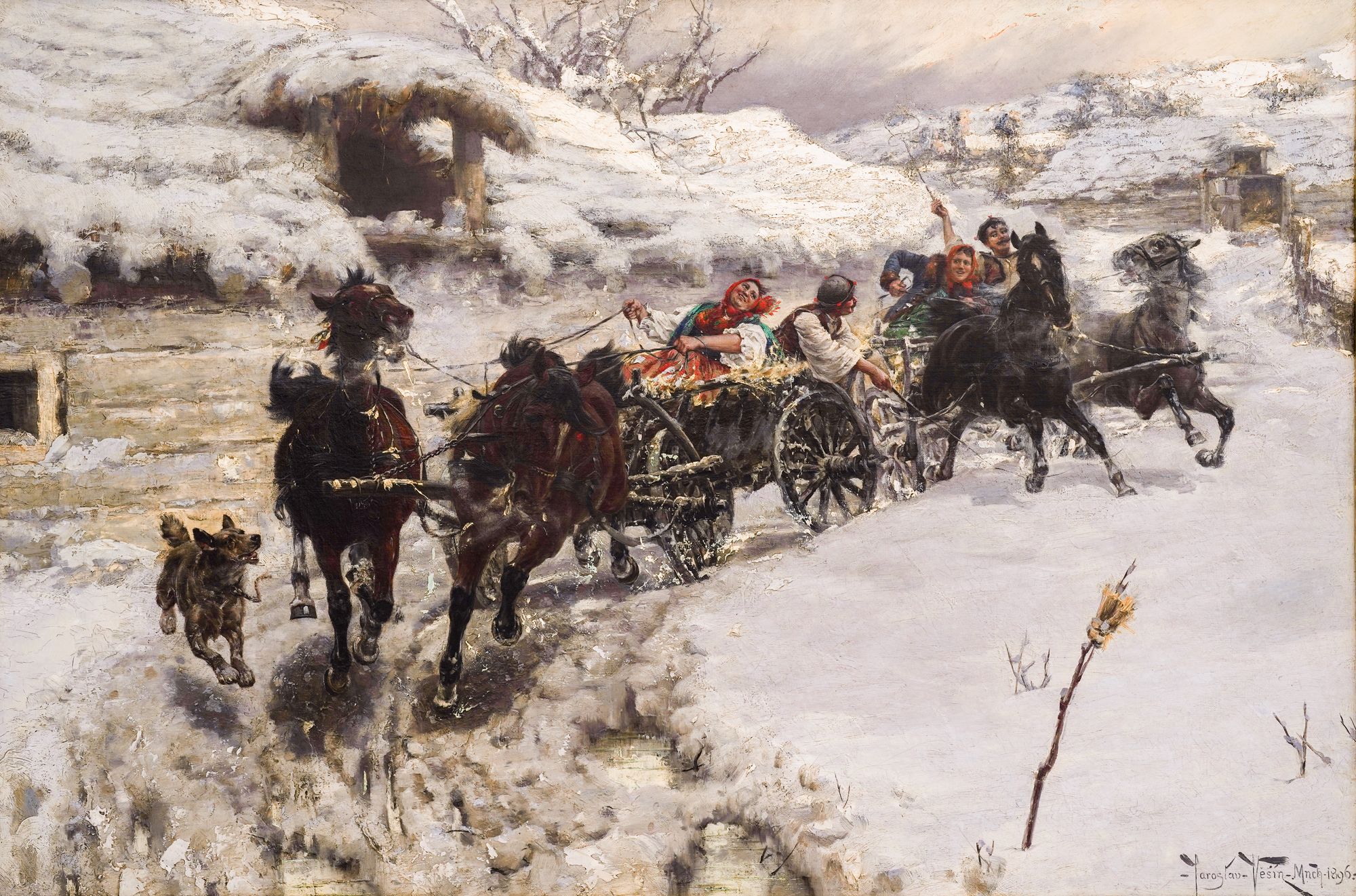Before his departure for Bulgaria in 1897, the Czech artist Jaroslav Vešin explored in depth the theme of domestic and provincial life in his work, especially in the last years when he lived in Munich. It was during this period that Veshin focused on compositions with sleighs and wagons, such as the Winter Race of 1896. It features the characteristic horses being harnessed by farmers in a wintry, rural setting. In this scene, the Czech artist skillfully captures a moment of a dynamic scene: the steam rising from the mouths of the harnessed stallions, the pleasure written on the faces of the villagers, the dog on the left trying to catch up with the sled in front and the farmer in reverse swinging with the whip, still show the dynamism and transitory nature of recreational contests like this. Yaroslav Veshin showed interest in this type of energetic equestrian scenes, from an early age. Two watercolor sketches named "Troika", mentioned in the monography on the artist with author Mara Tsoncheva, are a good example of Veshin's commitment to this theme since his student years. In the same monography we also find an almost identical composition to "Winter Race", named "Race" from 1897. Rushing horses are depicted with less detail for their heads and in a looser style. The same attention is lacking to the faces of the passengers in the wagons, as well as the dog on the left side of the picture. A much smaller oil on board sketch exists for this work from 1987. Despite the small format, the sketch is extremely detailed and with a clear concept for the finished large format canvas. Two other similar artworks from this period with similar compositions are "Sleigh Ride" from 1896 and "Wagon Race" from 1897. In the first example, the signature dog depicted on the left half of the current lot is found, as well as the almost identical image of the horse on the left side of the sled. The second example from 1897 reveals an almost identical landscape in the background, but this time presented in summer time. This suggests that the place represented on the canvas is based on a real location, which Vešin most likely saw during his travels between 1895-1897. It is precisely this attitude to the realistic grasp and capturing momentary scenes of everyday life in the countryside that determine the Czech an artist as one of the most established painters of domestic landscape from the end of the 19th century. (M.Z.)