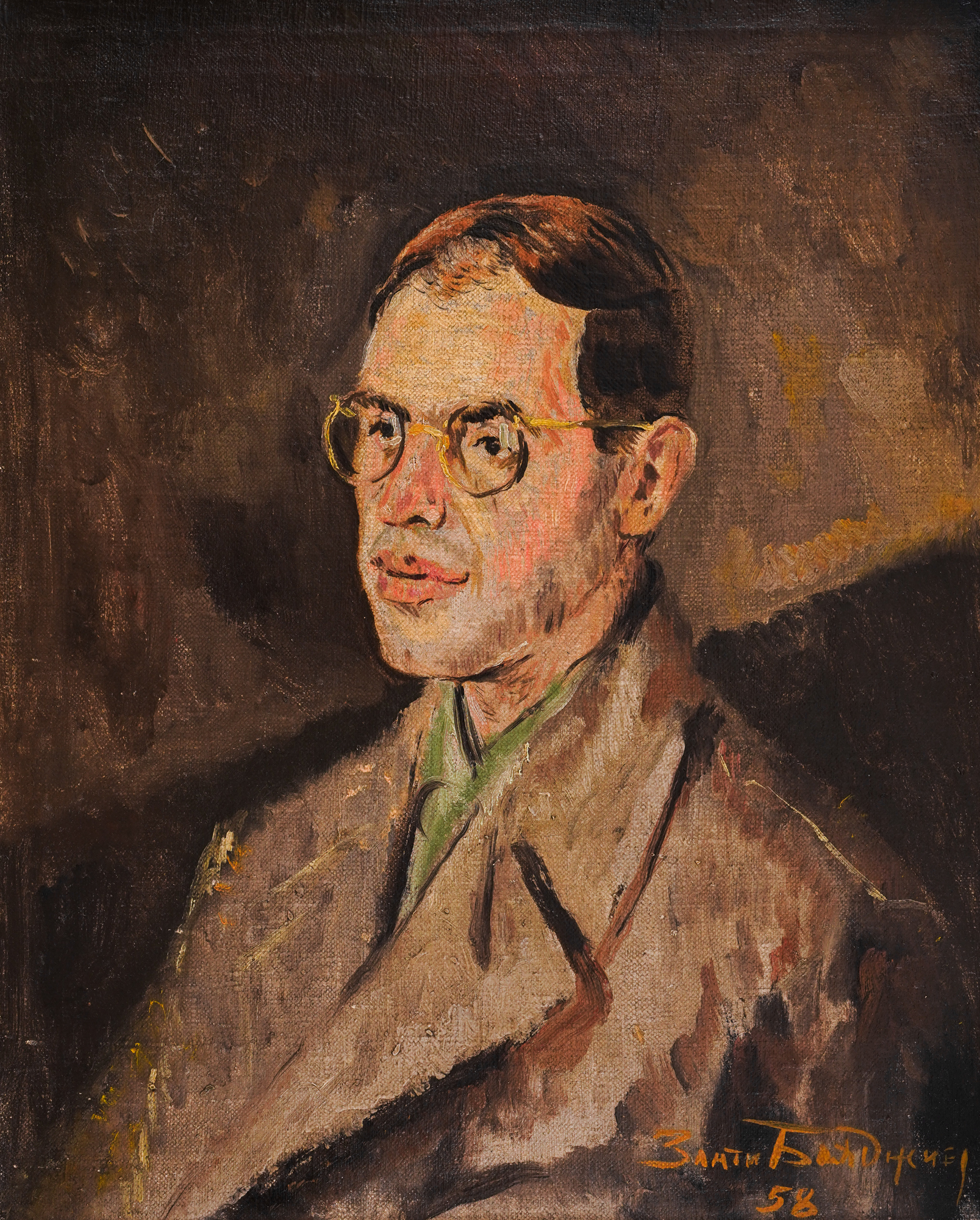 The portraits of Zlatyu Boyadzhiev changed drastically after the unfortunate year of 1951. If the first period of the artist’s work is defined by realistic painting, strongly influenced by academic and Western European traditions and techniques, the second period (after 1951) is characterized by a rougher, more expressive, and freer style — the lines are sharper, and the colors bolder and brighter. The same can be said of Boyadzhiev’s portraits: strongly contrasting and decorative colors appear — red, blue, and green in saturated combinations. The figures seem more dramatic and grotesque. The features are accentuated, the expression more powerful, often with a touch of spiritual strength. Compositionally, instead of classical balance, Boyadzhiev began to construct more complex and dynamic compositions. In his portraits after the stroke, there is a sense of psychological depth and spiritual energy. Such is the portrait of Nacho Kulturata (Atanas Krastev, 1922–2003). The sharp lines, contrasting dramatic colors, and expressive brushwork create an exceptionally serious, determined, and authoritative image of the sitter — an image well-suited to his personality. Atanas Krastev, known by his nickname “Nacho Kulturata” (Nacho the Culture), was born in Asenovgrad in 1922, but his life was inseparably linked with the city of Plovdiv. He was at the foundation of the establishment of Old Plovdiv, the administration dedicated to the restoration and preservation of cultural monuments in Plovdiv’s Old Town. Between 1969 and 1986, Nacho was its director, and largely through his initiative, the Old Town was transformed from a neglected and deserted area into an architectural reserve and a vibrant cultural center — writers, poets, painters, and musicians all found a stage there. Not by chance was Nacho Kulturata unofficially called “the Mayor of the Old Town” and made an Honorary Citizen of Plovdiv in 2002, one year before his death. Boyadzhiev’s portrait of Nacho was created in 1958, a full decade before “Kulturata” began deliberately working toward reviving the Revival-period splendor of Plovdiv’s Old Town. At that time, he was still appointed to the Department of Science, Art, and Culture at the Municipality of Plovdiv — probably the origin of his nickname. Being a friend of Nacho’s since the 1950s, Zlatyu knew well how to portray his comrade in the 1958 portrait, skillfully depicting an exceptionally determined, ambitious, serious, and direct cultural figure at the age of 36, who was only just beginning to prove himself to society and his peers. Atanas Krastev himself once spoke of Zlatyu Boyadzhiev in the following way: “Zlatyu Boyadzhiev was the most radiant image of a man I have ever known. He was a man-god! His almost mad diligence was inseparable from the incredible joy of creation.” (M.Z.)