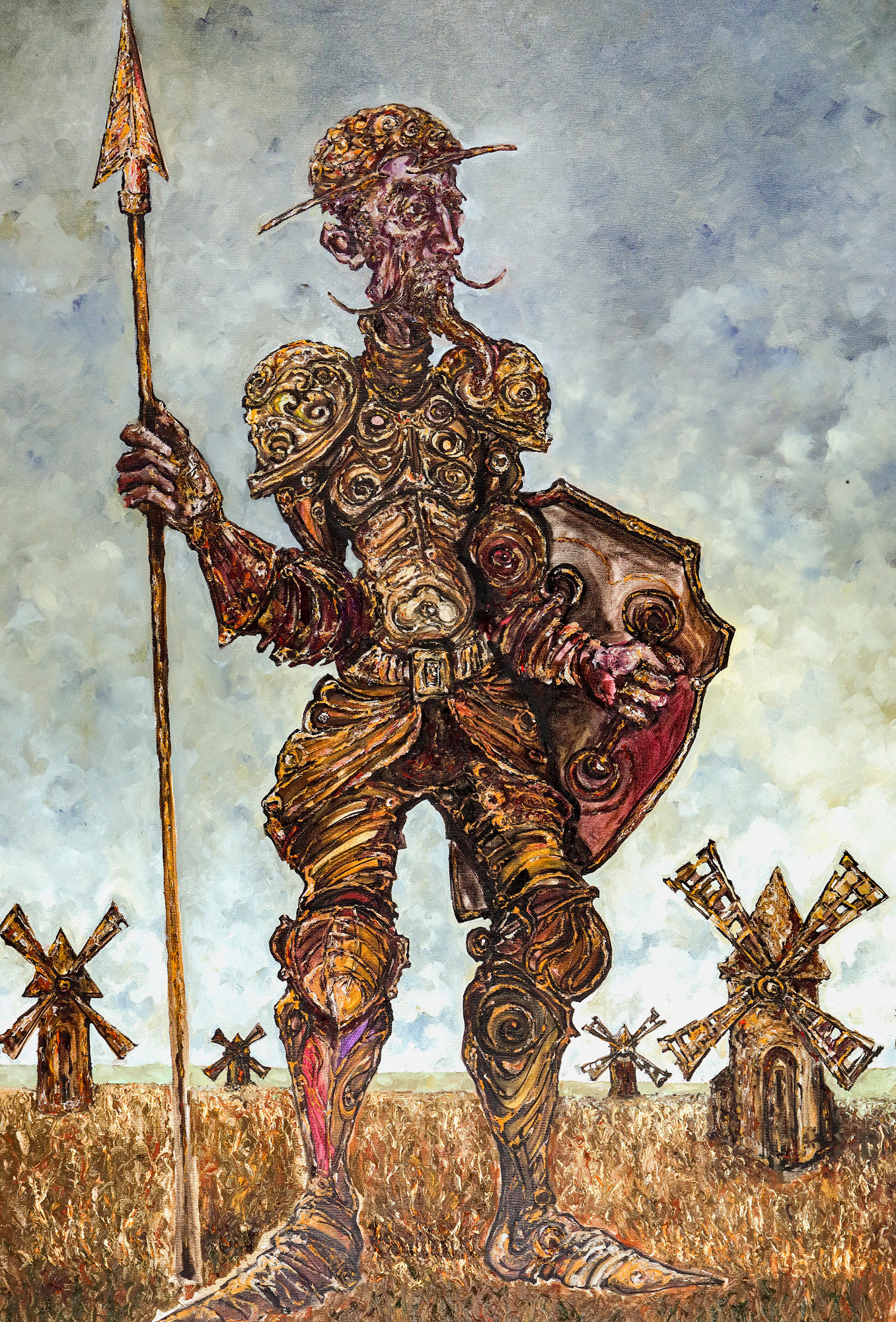 semnat lateral dreapta, cu negru, "Pușcuță, 2024"; semnat, datat și intitulat pe verso, cu negru, "Dionis Pușcuță, Don Quijote, 2024"