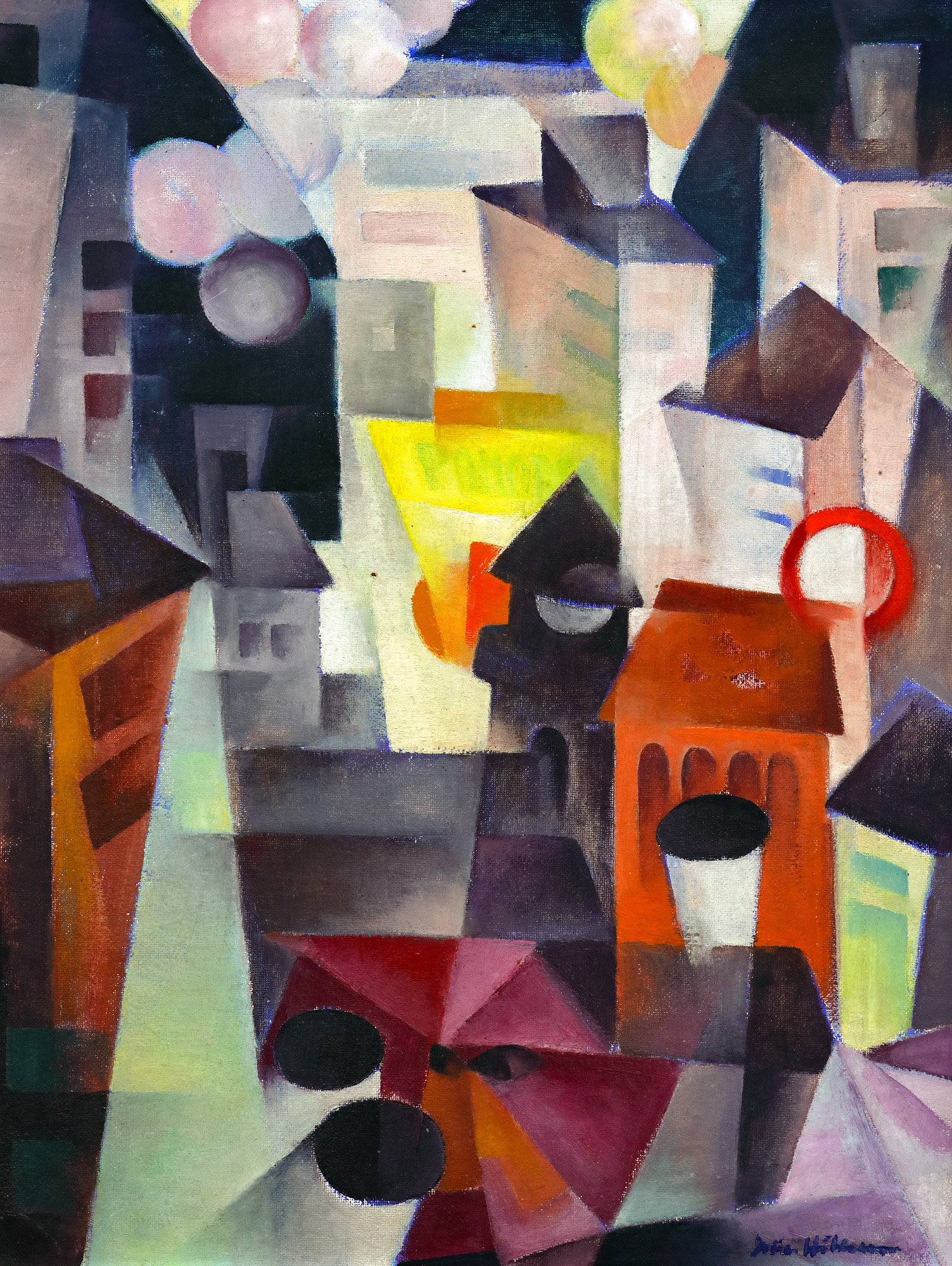 semnat dreapta jos, cu albastru, "Iulia Hălăucescu"; semnat și intitulat pe verso, cu negru, "Iulia Hălăucescu, Orașul meu"