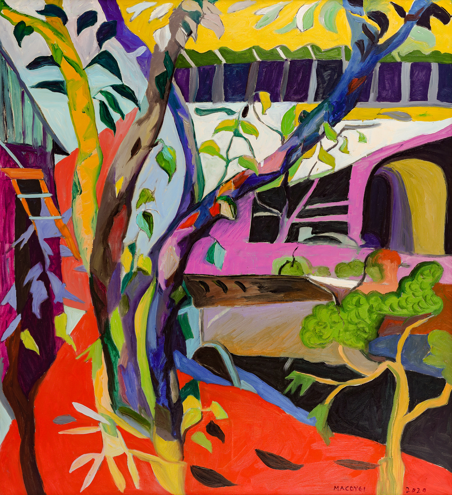 semnat și datat dreapta jos, cu negru, "Macovei, 2020"; semnat, datat și intitulat pe verso, cu negru, "Dumitru Macovei, Grădină, 2020"