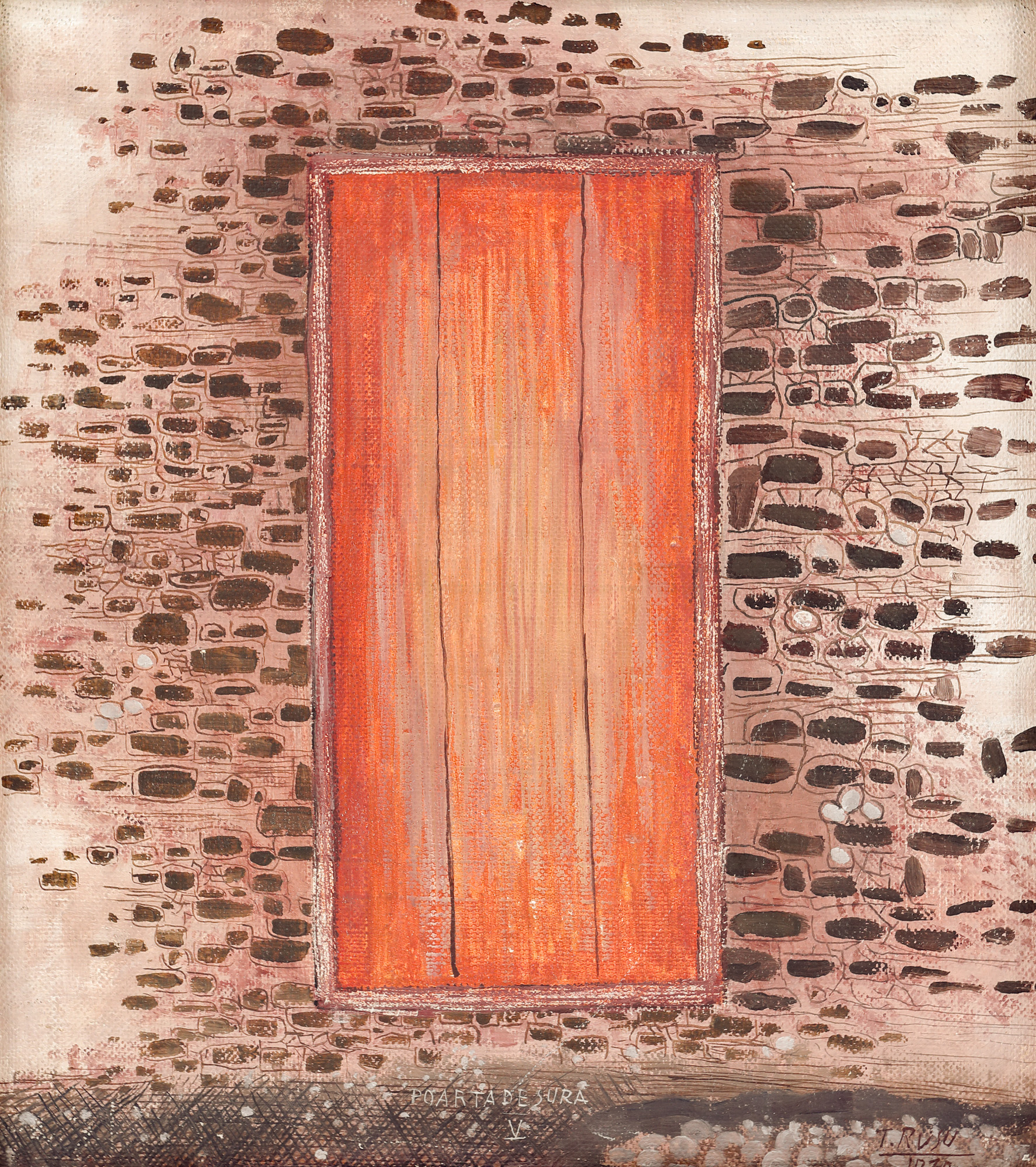semnat și datat dreapta jos, cu brun, "T. Rusu, 1970"; intitulat central jos, cu alb, "Poartă de șură V"