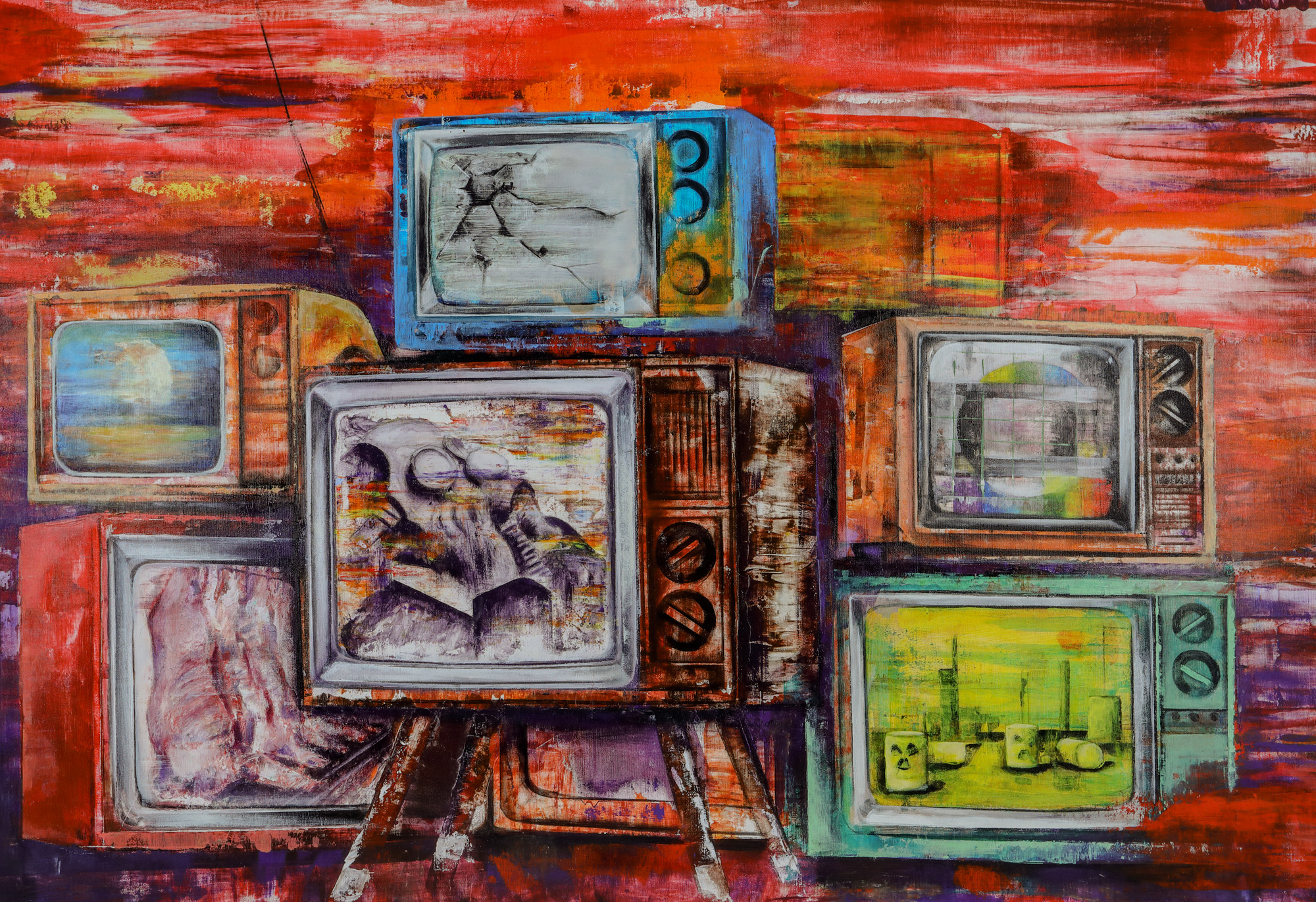 „Screens of Reality” este un titlu evocator și sugestiv, care poate captura esența compoziției. Ecranele televizoarelor pot fi privite si ca niște ferestre către diverse aspecte ale realității, iar privitorii sunt invitați să privească înăuntru pentru a reflecta și a înțelege mai bine lumea înconjurătoare. Ecranul mare, plasat în mod strategic în centrul compoziției, strălucește intens, vrând să captiveze atenția privitorului. Similar cu „Strigătul” lui Munch, această imagine poate evoca sentimentul de anxietate și disperare. Masca de gaze și gesturile personajului sugerează o stare de panică și sufocare. Privirea sa îndreptată spre cer poate simboliza o chemare în ajutor sau o căutare a unei soluții în mijlocul disperării. Imaginea poate fi interpretată ca o exprimare a anxietății și a suferinței interioare a individului în fața unei lumi ostile și amenințătoare. În jurul ecranului central, sunt dispuse alte televizoare, fiecare afișând instantanee diverse care par să compună o panoramă complexă a lumii contemporane. Fondul tabloului este dominat de o nuanță intensă de roșu, care poate evoca atât nelinistea, cât și ideea de alarmare sau alertare, sugerând o atmosferă vibrantă și captivantă, dar și unele avertismente sau pericole iminente. Tematica acestor imagini este diversă si include aspecte legate de conflictele armate, poluarea mediului, dezastrele naturale, sau alte aspecte legate de natura psihicului uman. Totodată, tabloul sugerează o reflecție profundă asupra modului în care mediile de comunicare modelează percepțiile și comportamentele noastre și impactul lor asupra societății și a lumii înconjurătoare. Acestea induc privitorului o stare de angoasa si de anxietate constanta cu privire la un viitor sumbru unde un eveniment catastrofal este iminent. Privitorul este invitat să reflecteze si asupra felului în care este influențat de aceste medii și asupra rolului său în ceea ce privește consumul și interpretarea informațiilor și a imaginilor transmise de mass-media. (Andrei Tiba)