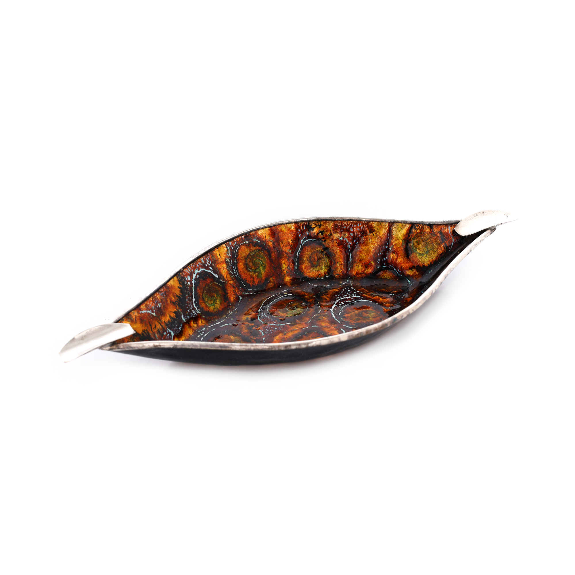 46. Scrumieră Art Deco din cupru, decorată cu bordură din argint și email, cca. 1930
