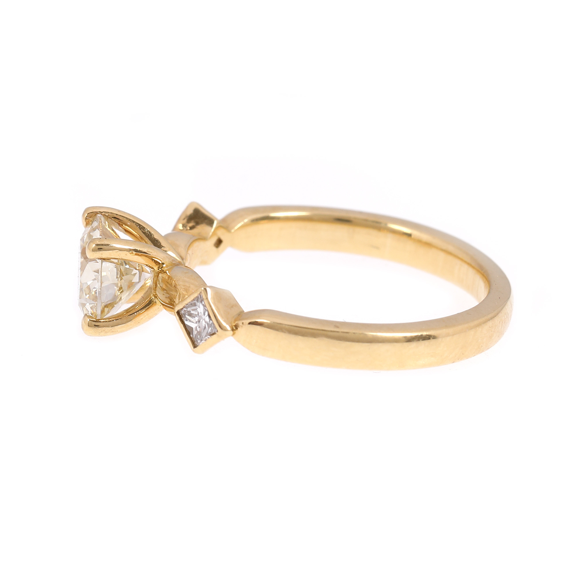 1 diamant rotund briliant, culoare U-V, claritate VS2, cca. 1,16 ct. și 2 diamante princess cut, culoare J-K, claritate VS, cca. 0,14 ct.