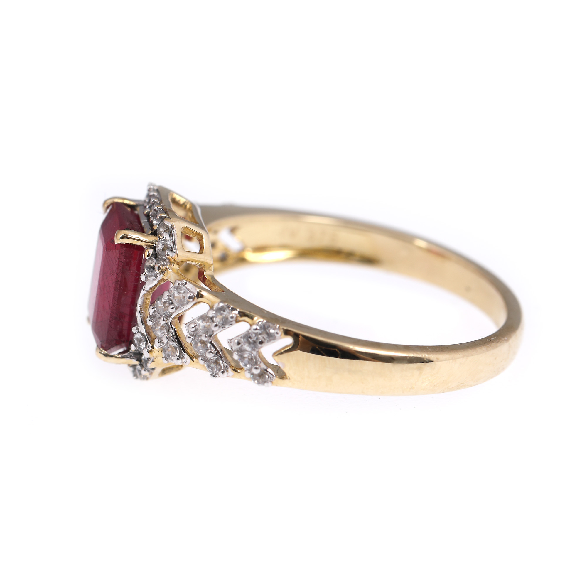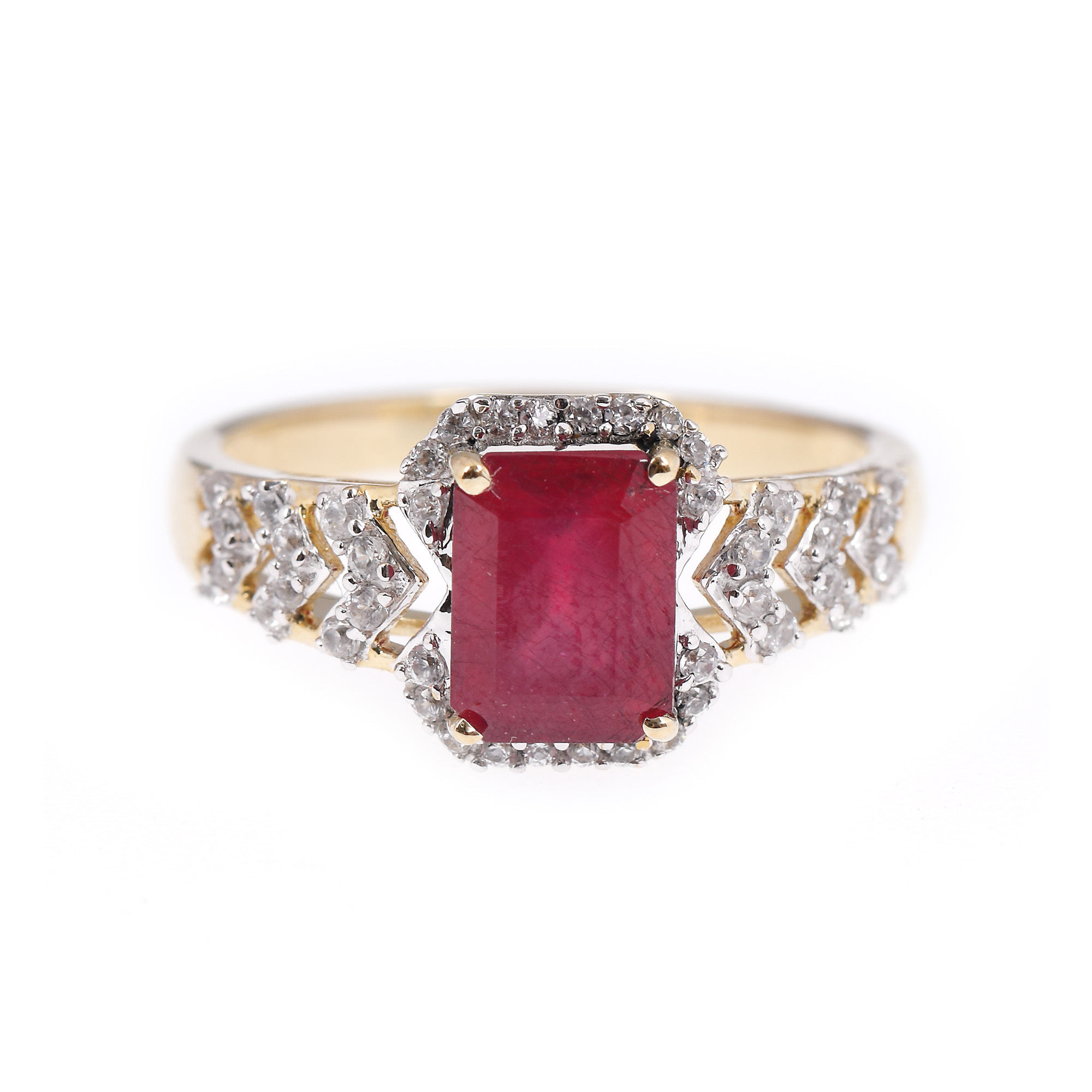 1 rubin emerald cut, culoare roșu, claritate moderately included, cca. 2,1 ct. și 44 topaze rotund fațetate, culoare alb, claritate eye-clean, cca. 0,35 ct. Rubinul este fracture filled.