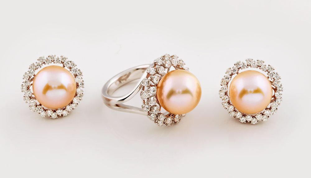 Cercei - aur alb, 18 k; 64 diamante cu tăietură briliant cca. 1,94 ct total si 2 perle de apă dulce 13-14 mm fiecare; 13,7 gr; culoare G; claritate VS; d=2,5 cm; Inel - aur alb, 18 k; 32 diamante cu tăietură briliant cca. 1,38 ct total şi perlă de apă dul