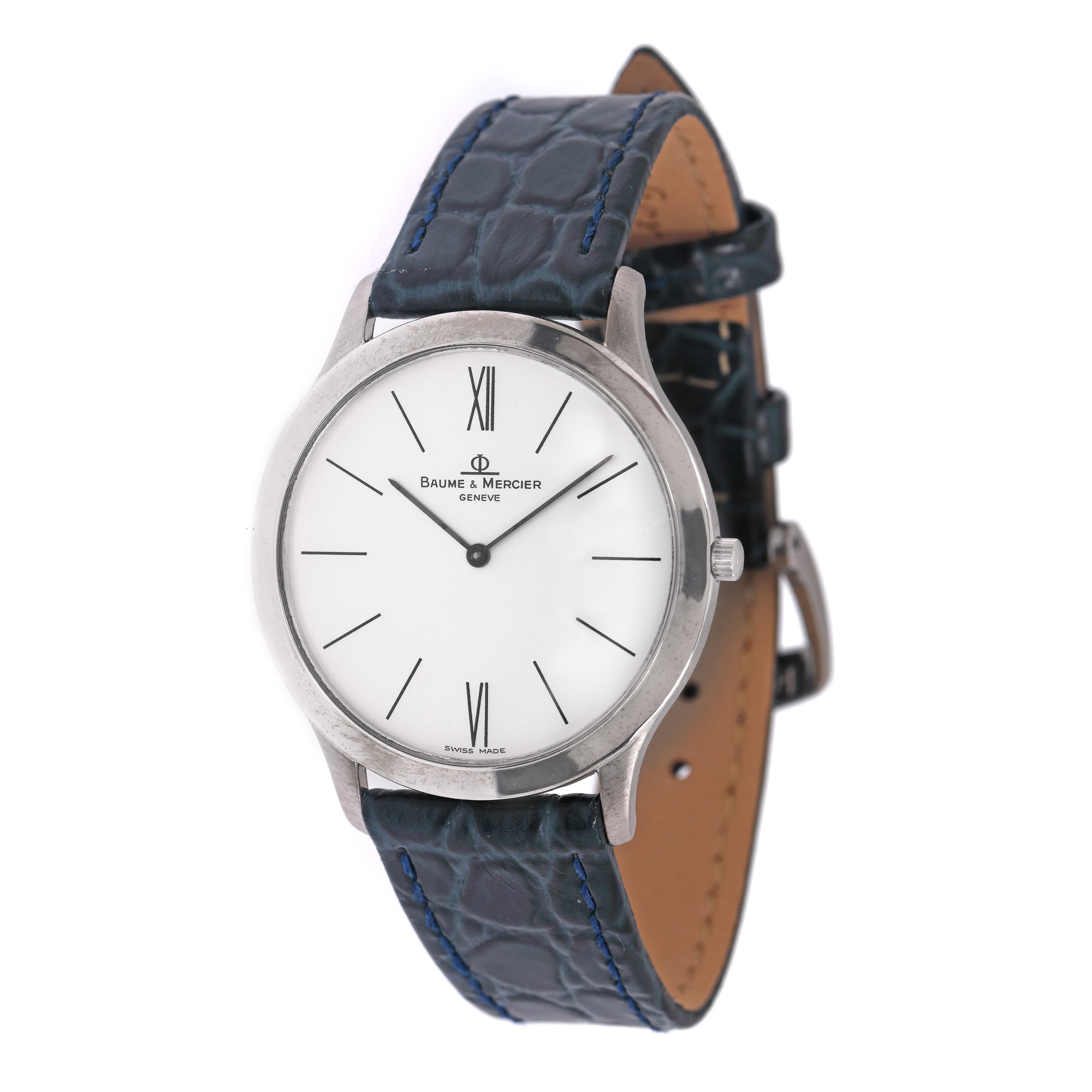 Ceas Baume & Mercier Classima, din aur alb, de mână, bărbătesc, referință MV045155 sau MV045154 , mecanism quartz. Cadran de culoare alb, cu indici orari negri și numerale romane pentru orele 12 și 6. Curea din piele de crocodil, de culoare albastră, cu cataramă, înlocuite aftermarket.