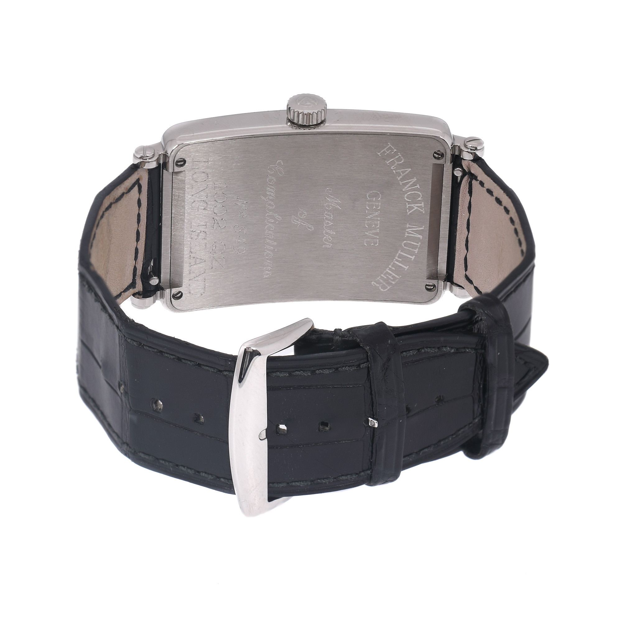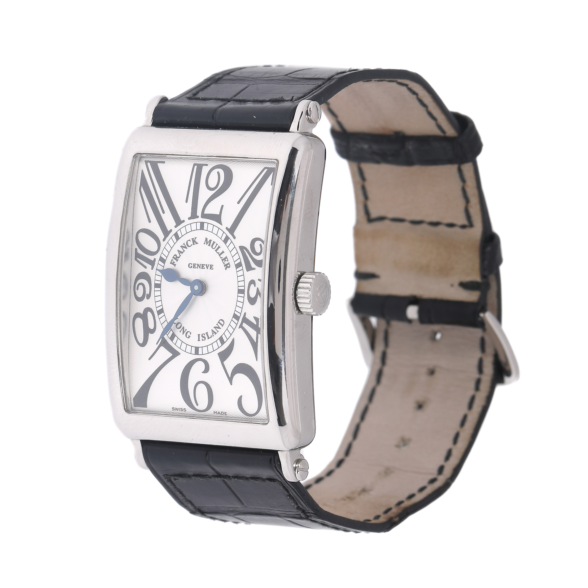 Ceas Franck Muller Long Island, de mână, bărbătesc, referință 1002 QZ, mecanism quartz. Cadran de culoare argintiu, decorat în tehnică guilloché, model flinqué, cu numerale arabe de dimensiuni variabile. Curea din piele de culoare neagră, cu cataramă, originale.