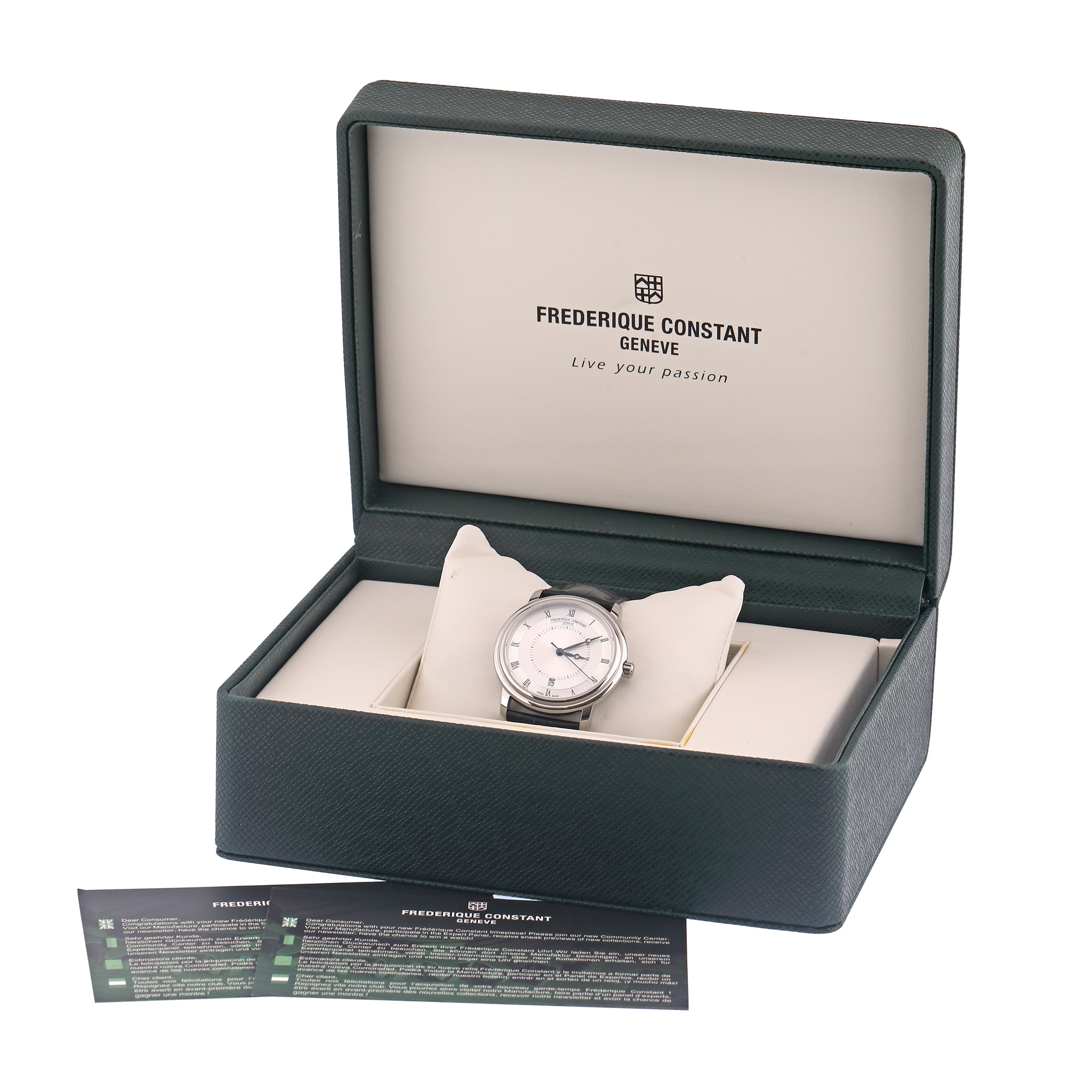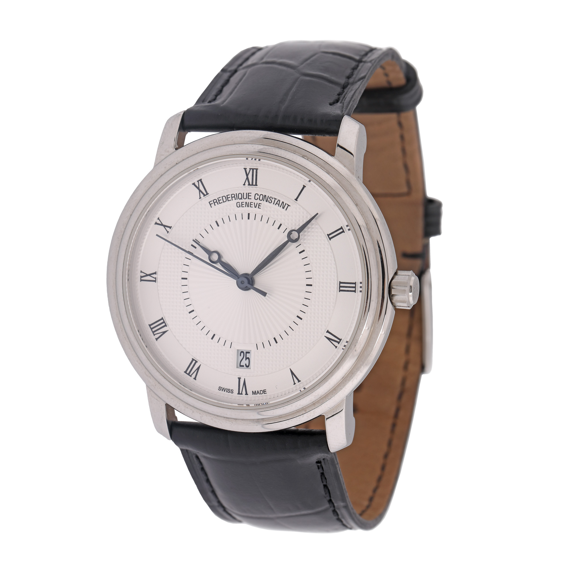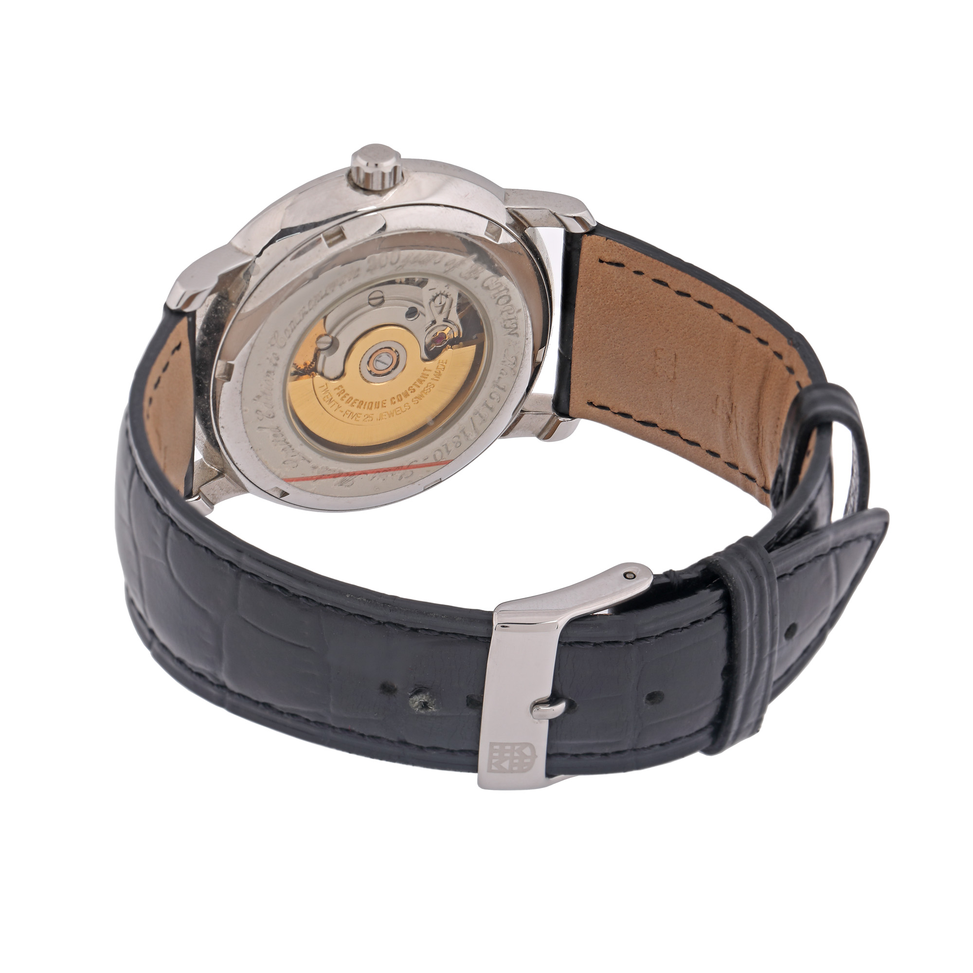 Ceas Frederique Constant, de mână, bărbătesc, ediție limitată 1611/1810 pentru comemorarea a 200 de ani de la moartea compozitorului Frédéric Chopin, referință FC303CH4P6, mecanism automatic, calibru FC-303. Cadran argintiu, decorat în tehnică guilloché, cu numerale romane și registru pentru dată în dreptul orei 6. Curea din piele de crocodil, de culoare neagră, cu cataramă, originale. Accesorii: cutia originală.