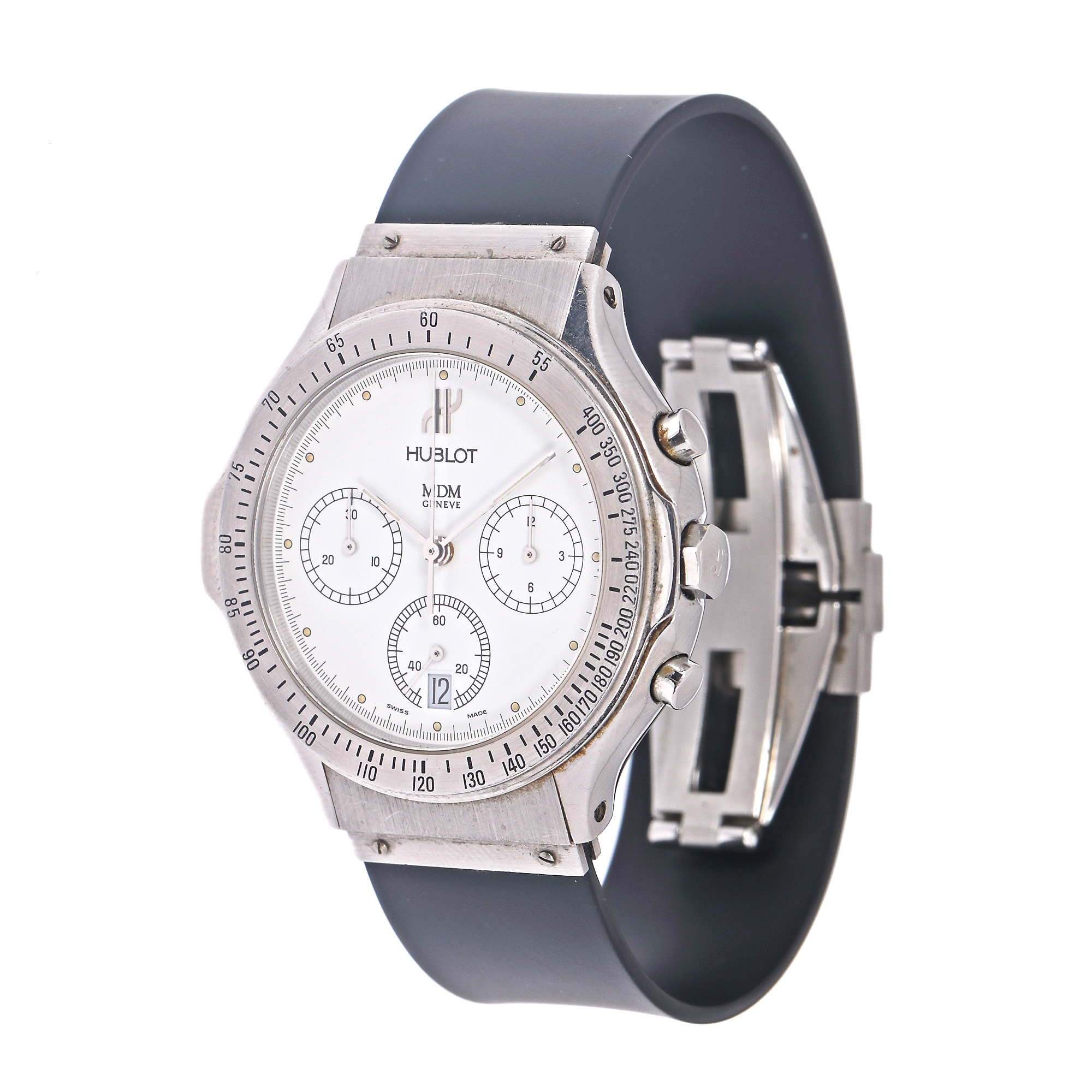 Ceas Hublot MDM Chronograph, de mână, bărbătesc, referință 1620.1, mecanism quartz cu funcție chronograph. Cadran de culoare alb, registru pentru secundar periferic între orele 5-7, două registre chronograph pentru 12 ore între 2-4 și pentru 30 minute între 8-10 și registru pentru dată în dreptul orei 6. Bezel gradat cu scală tahimetrică. Curea din cauciuc, de culoare neagră, cu sistem de închidere tip deployant, originale.